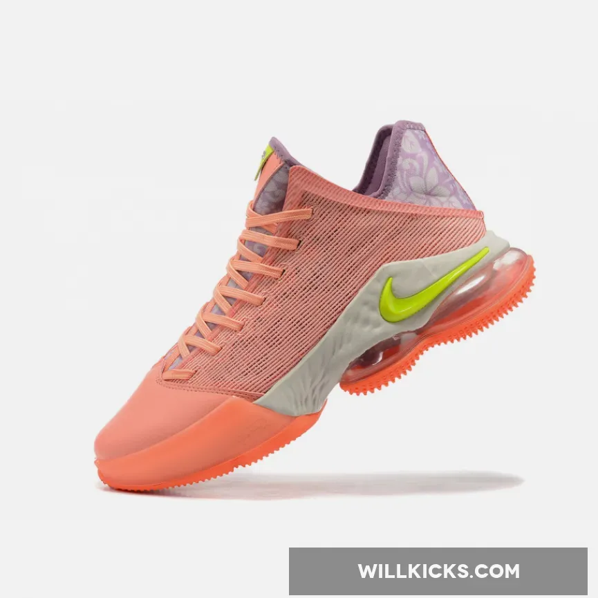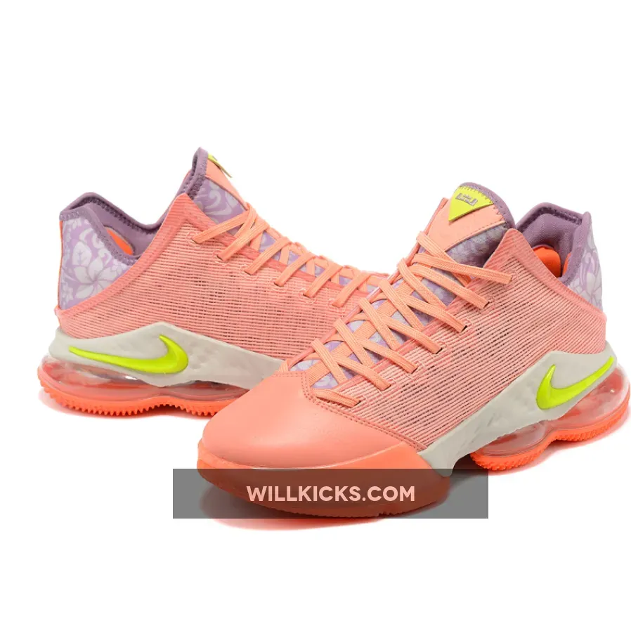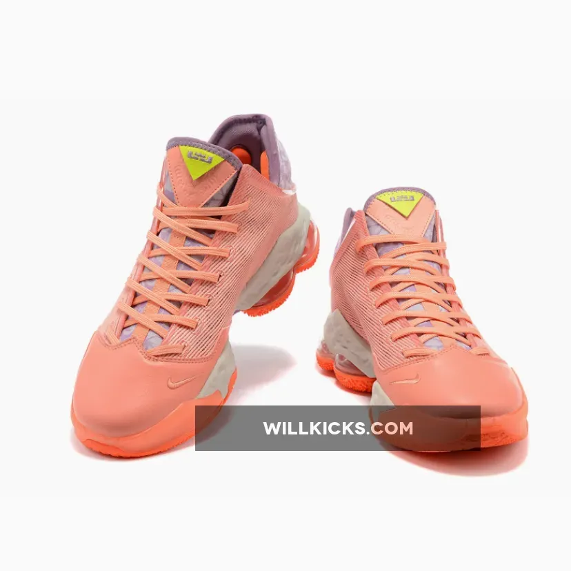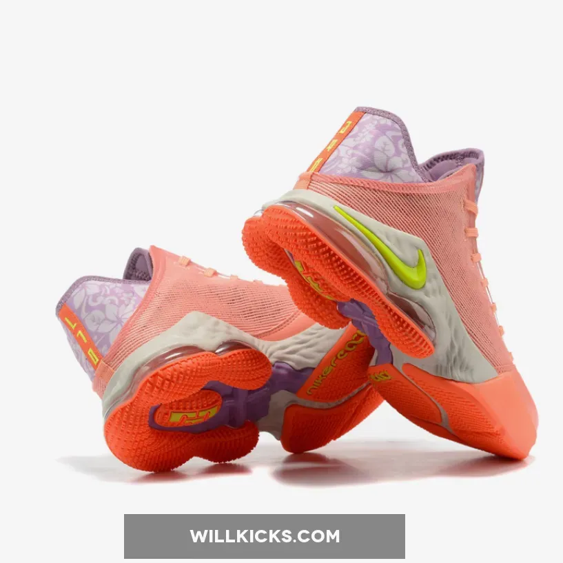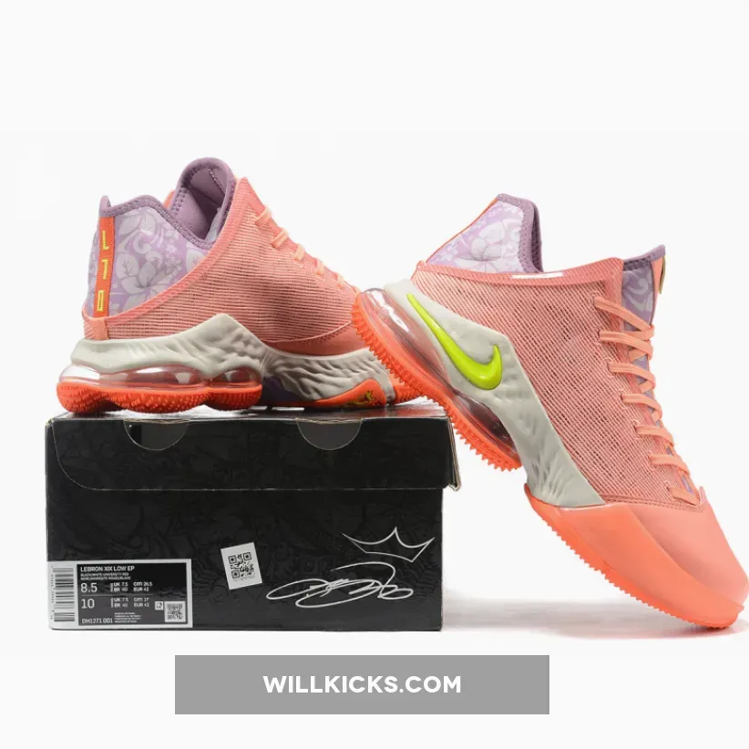 Perfect for the summer months, this offering of the low-top Nike LeBron 19 features a Salmon-colored textile mesh upper and leather toe box paired with Volt and Purple contrasting accents. Highlighting the shoe are floral patterns on the tongues and heels.