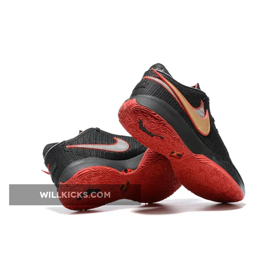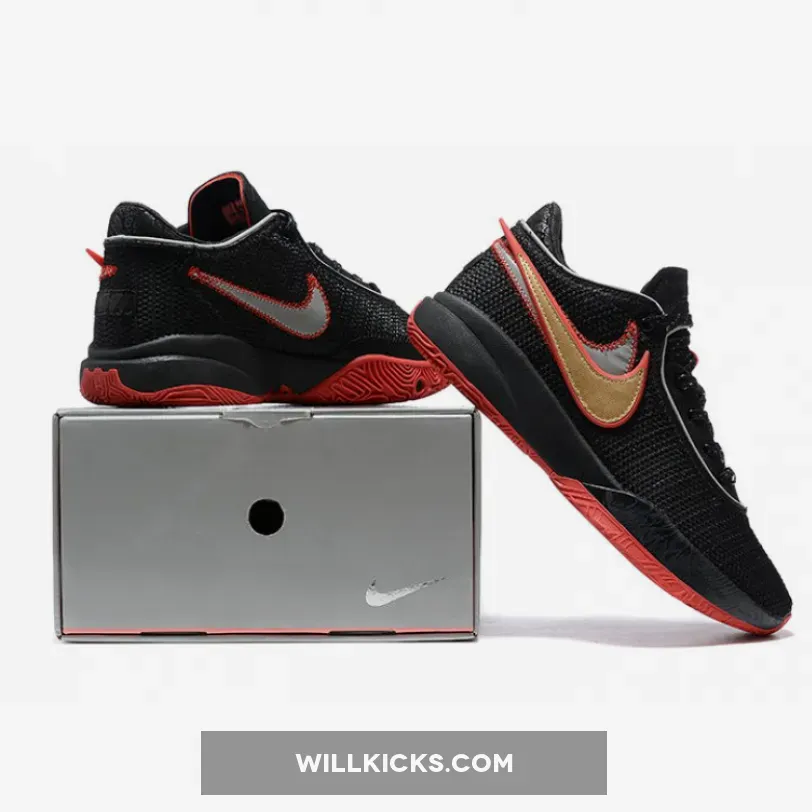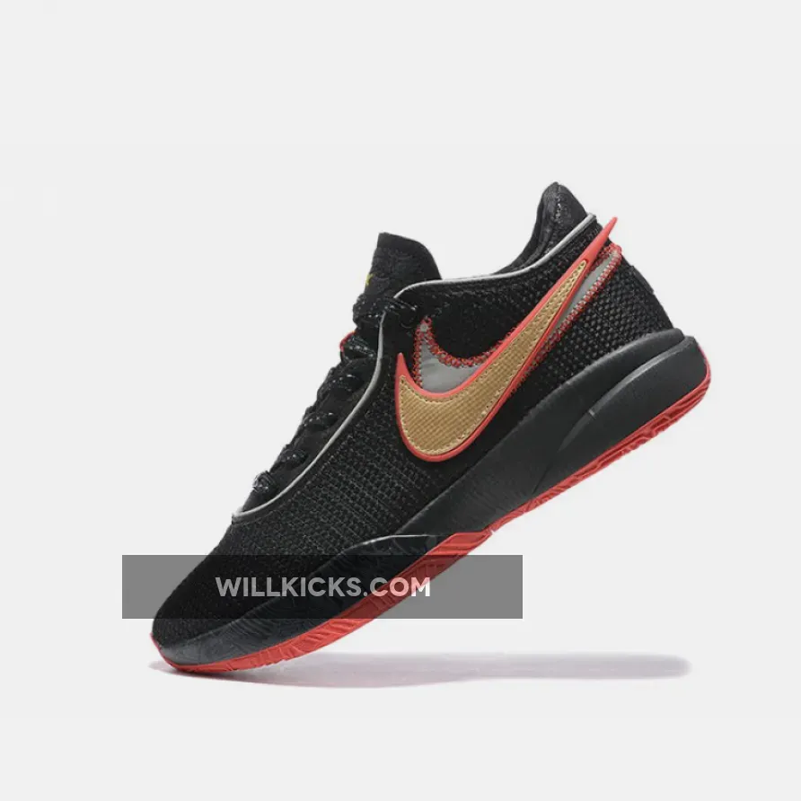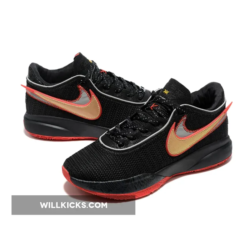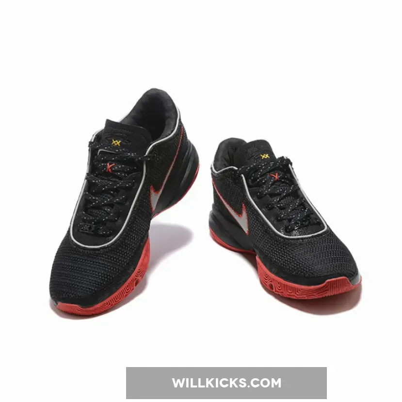 The upper section of the Lebron 20 model is made of black woven textile with a double Swoosh on its right side. The sneaker has an elongated tongue beneath the laces made from cotton. Its midsole and outsole, which are both made from rubber, appears in the black and red colors.