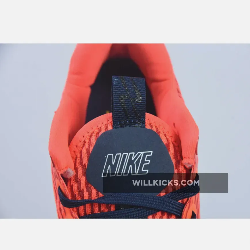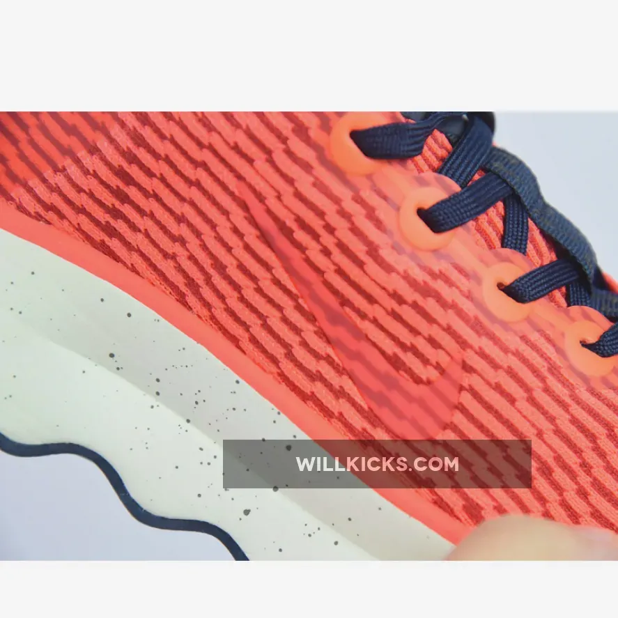 This colourway features a vibrant orange lightweight mesh upper with navy accents on the laces, midsole Swoosh, and heel counter. Speckles on the foam midsole bring more details to the shoe. Waffle traction patterns on the front and back with wavy patterns on the midfoot complete the rocker outsole.