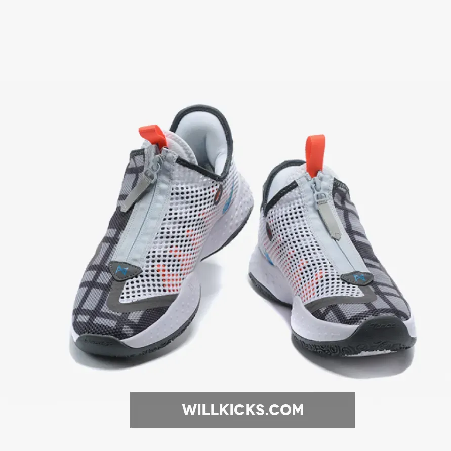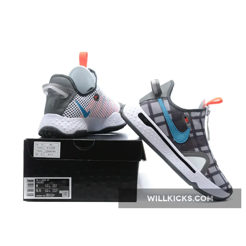 Dressed in a Football Grey, Laser Blue, and Light Smoke Grey color scheme. This PG 4 features a Grey plaid upper contrasted with White on the medial mesh side panel, Orange covering the pull tabs and lockdown cables as well as Blue Swooshes on the sides. A White foam midsole atop a dark and light Grey rubber outsole completes the design.