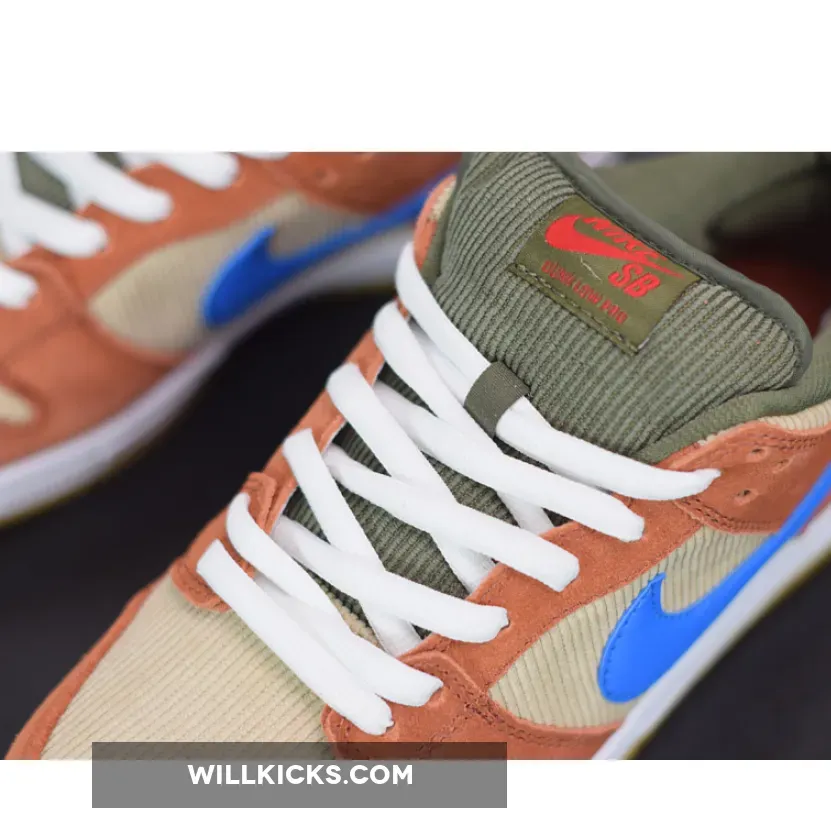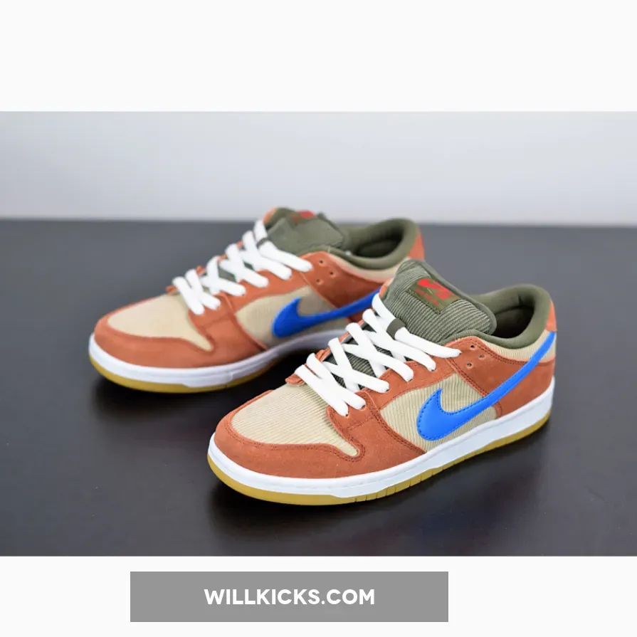 The Dunk Low Corduroy Dusty Peach features a full corduroy upper – a material that any long time SB fans are sure to be familiar with. Painted in an earthy colour scheme, brown panels contrast against peachy overlays for a perfectly colour blocked look. The overlays then switch their construction to suede and their color to the “Dusty Peach” shade of orange that’s been prevalent on many a Nike Skate model as of late, while a bold photo blue Swoosh provides a welcomed touch of abstract color. A White midsole atop a Gum rubber outsole completes the design.