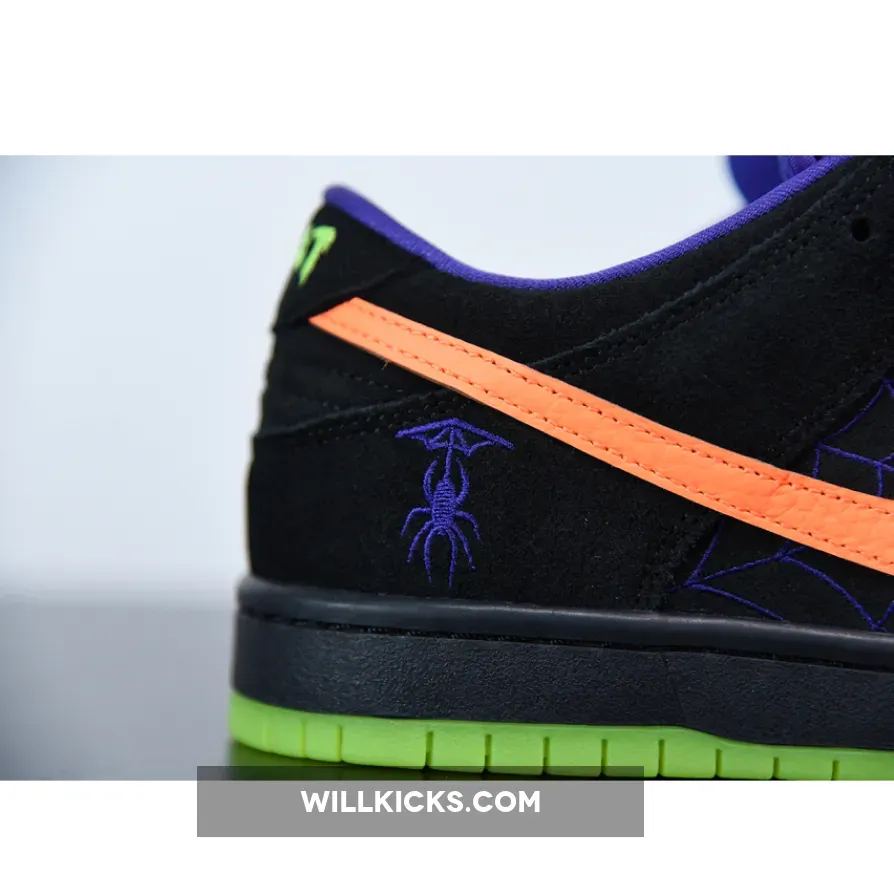 Whereas the Air Force 1 and Air Max 98 took on bones and cemetery motifs, respectively, the skate-focused silhouette is just slightly more subtle: graphic touch-ups at the profile tell a story of a spider and its web through purple embroidery, sitting next to contrast accents of bright orange and lying atop a backdrop of matte black suedes.