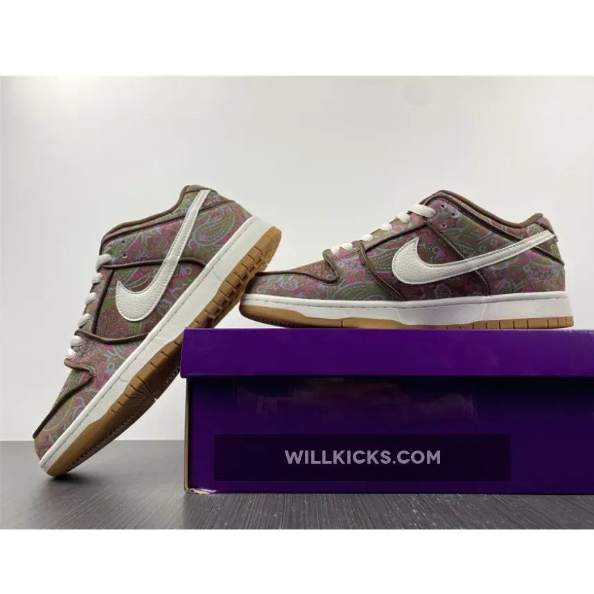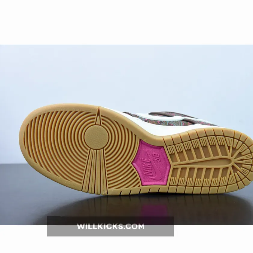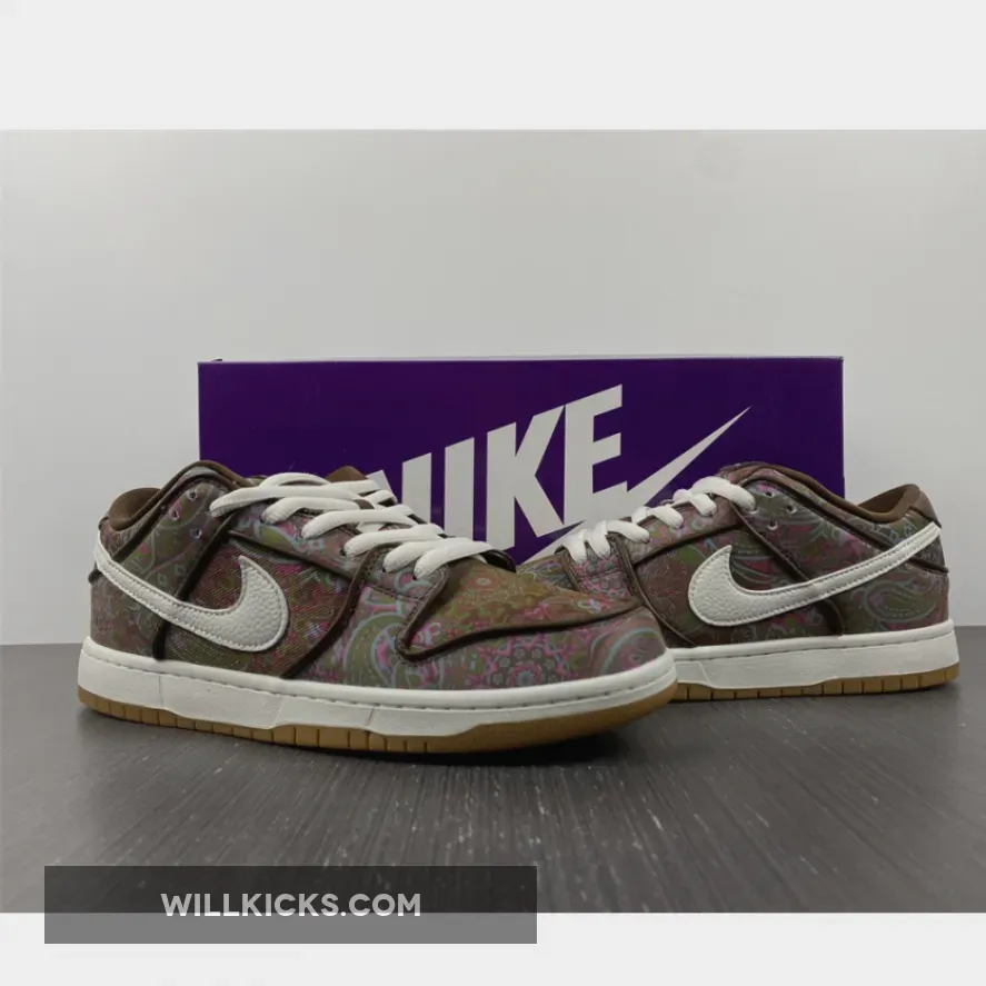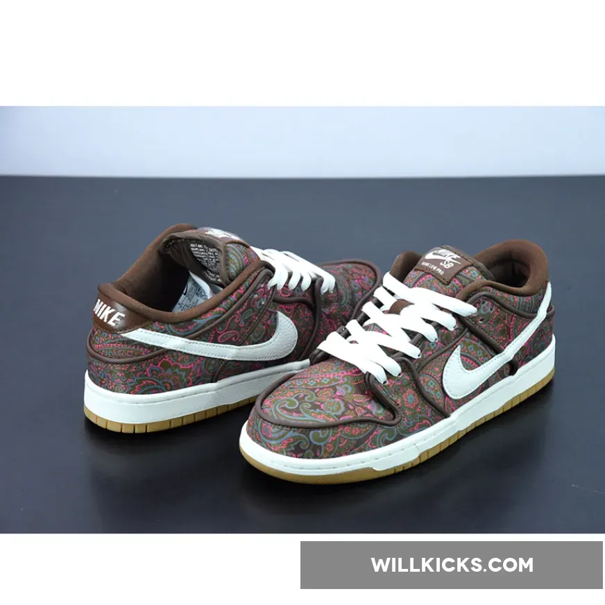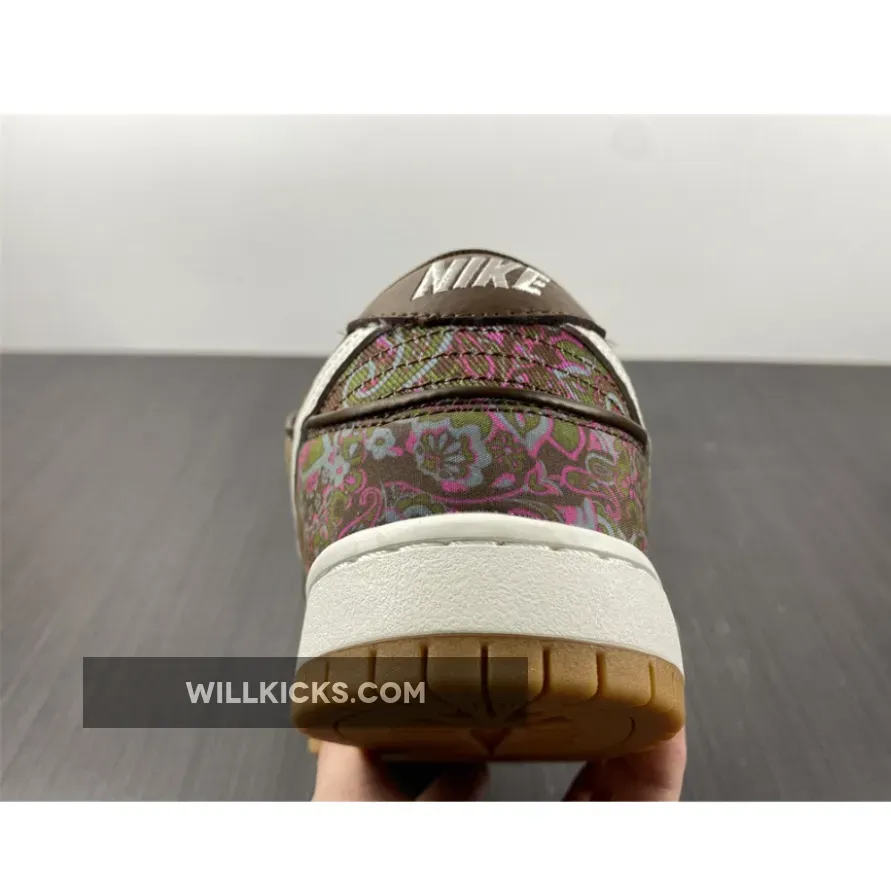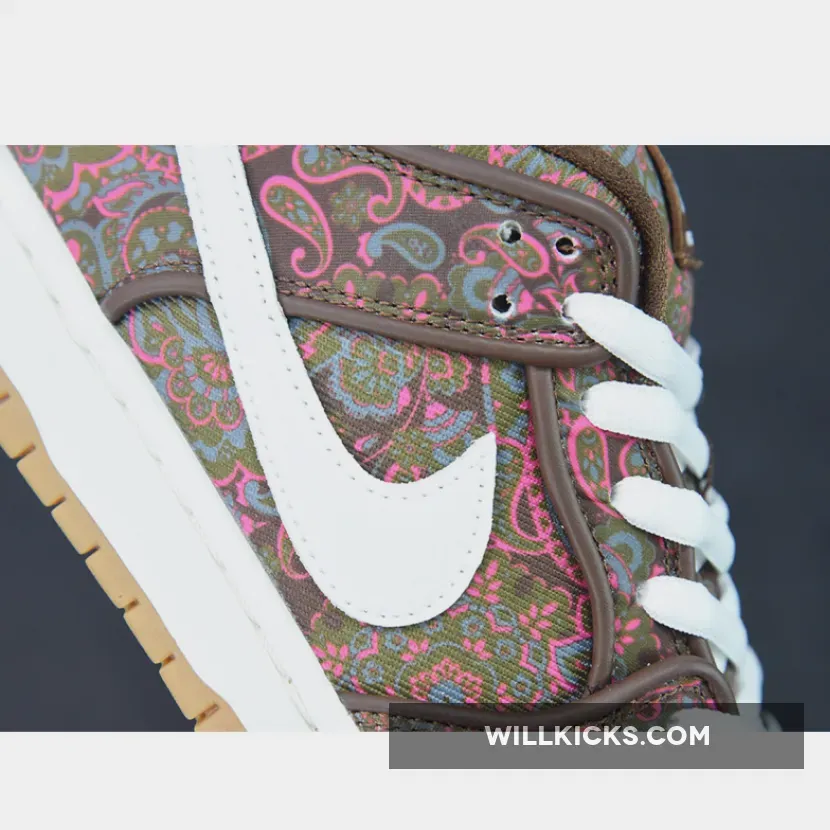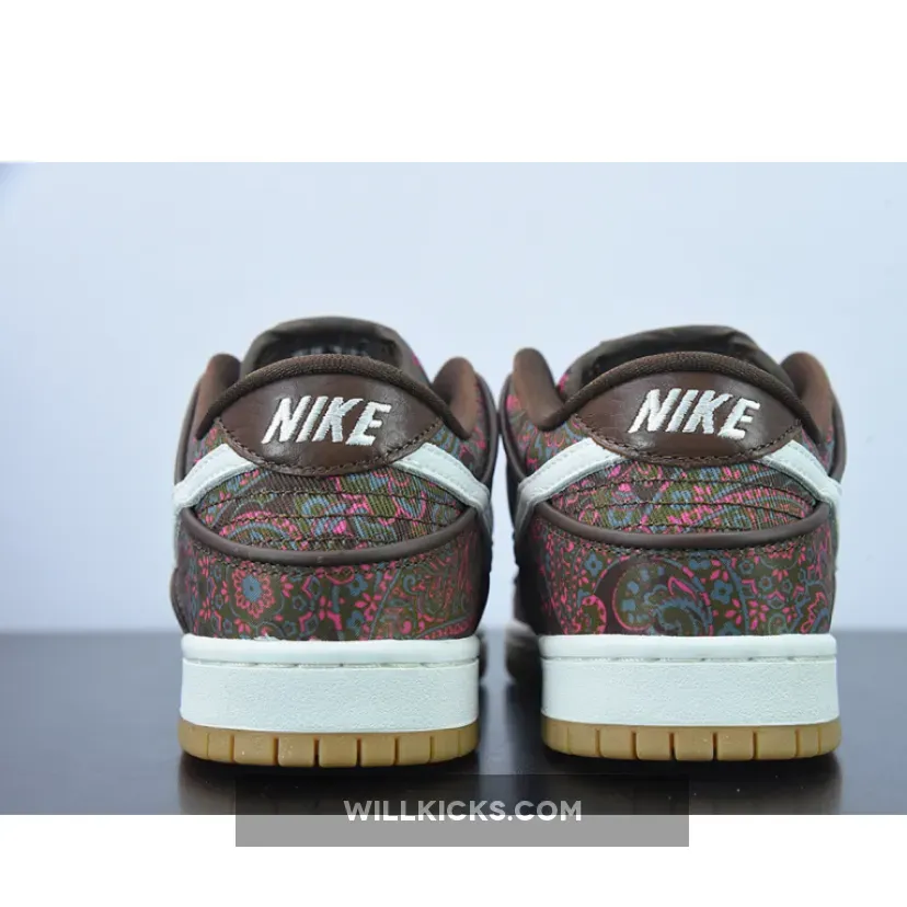 Nike SB Dunk Low Paisley Burgundy is the skateboarding silhouette’s answer to Nike Dunk Low’s “Paisley Pack”. This pair boasts a premium canvas construction that’s decked with a bolder version of the teardrop-shaped pattern. The elegant burgundy base of this SB Dunk Low is designed with chic pink, green and sky blue paisley prints that extend towards the entire tongue and at the heel. Matching the statement-making palette of the upper are matching chocolate-coloured laces and inner lining. In contrast, Swooshes on both the lateral and medial sides sport a colourless hue.