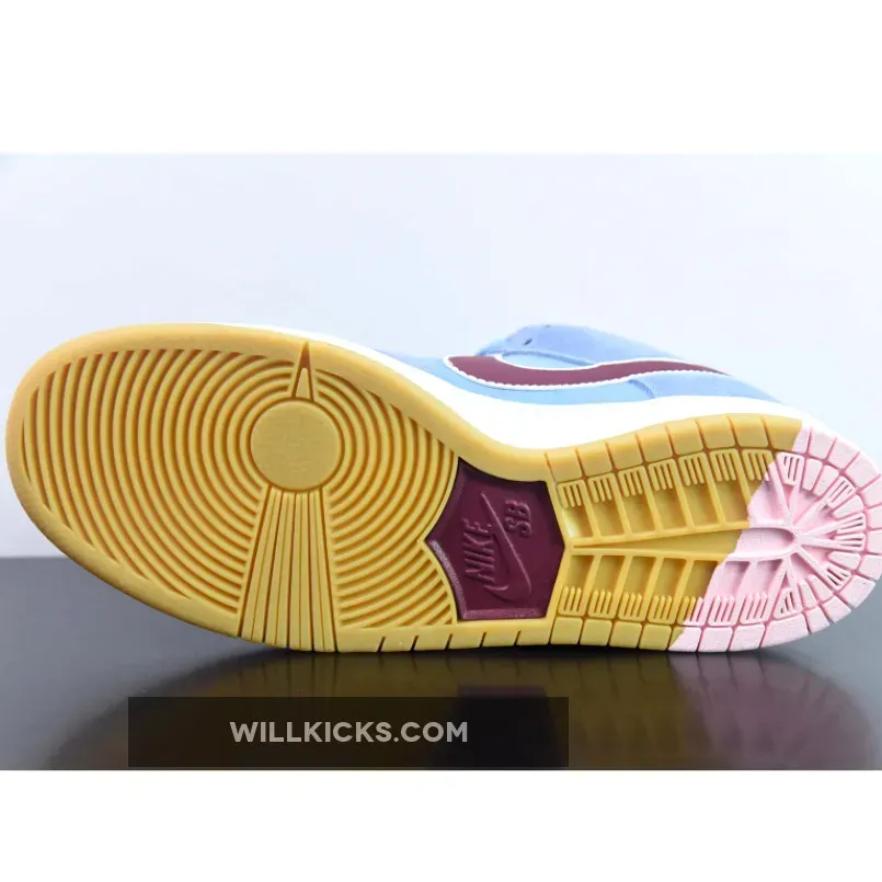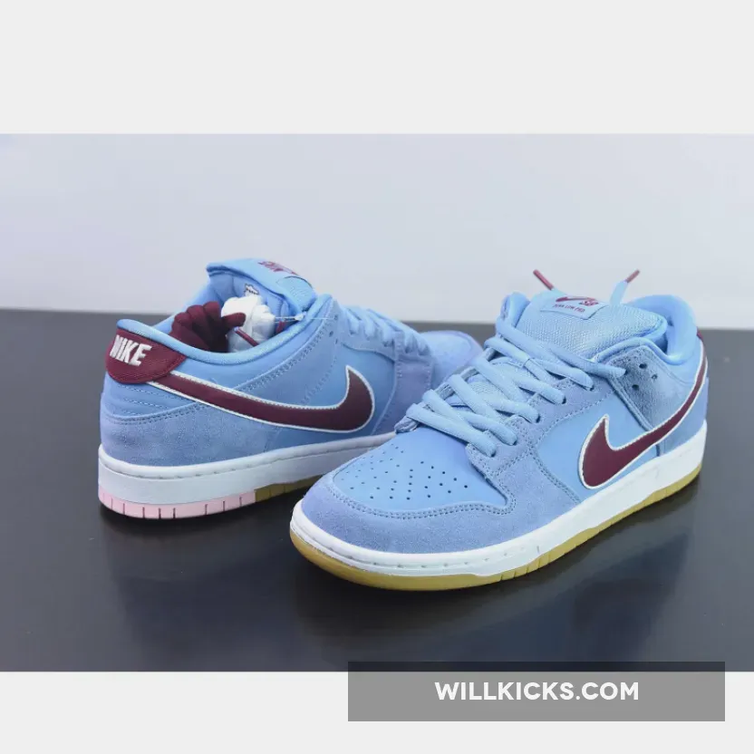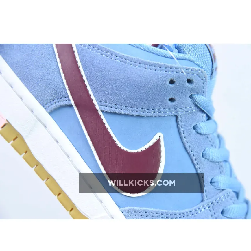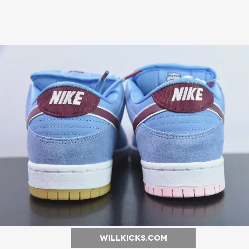 The “Phillies” SB Dunk Low dons a predominantly light blue color scheme that’s offset by burgundy hits on the Swoosh branding and other Nike logos, which is reminiscent of the MLB team’s uniforms from the ‘80s. Aside from its inspiration, the offering features an all-suede upper with team red Nike Checks outlined with white leather trimming. This theme is whimsically designed to show a Big League Chew mark on the heel. Behind the tongues feature the Liberty Bell on one tongue with a Philly Cheesesteak on the other. Additional highlights include a bubble gum graphic on the gum sole.