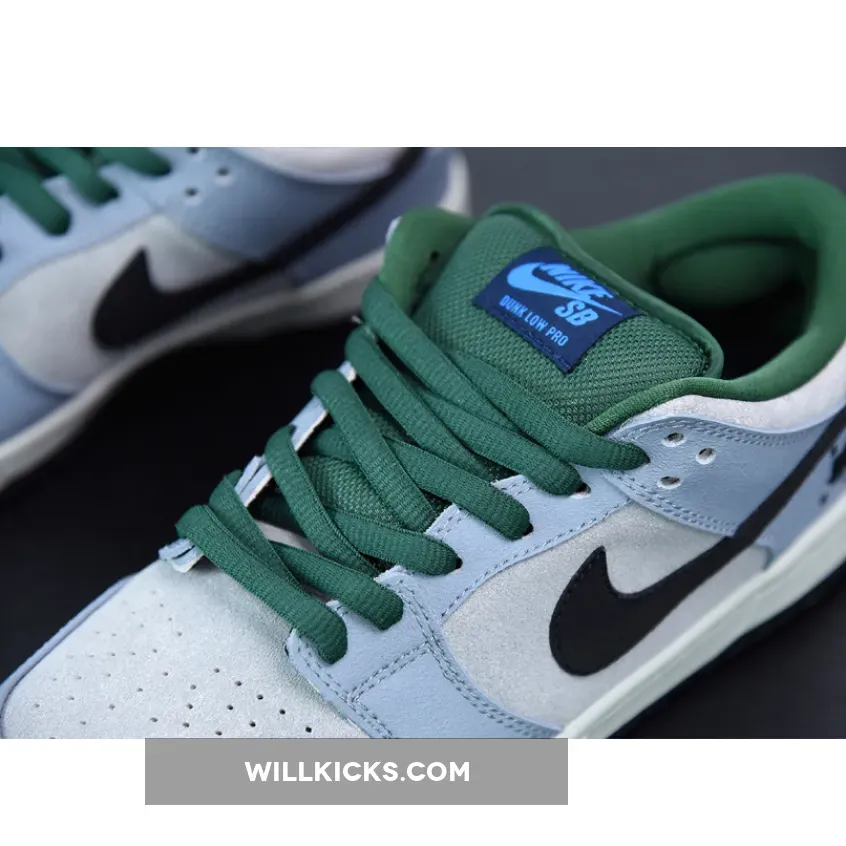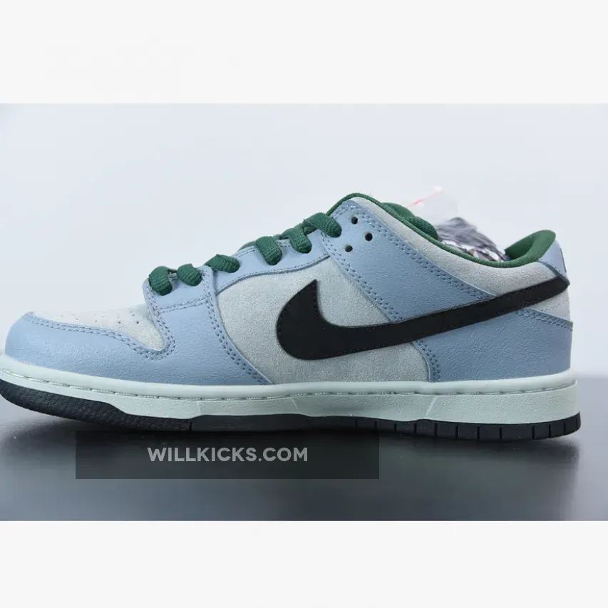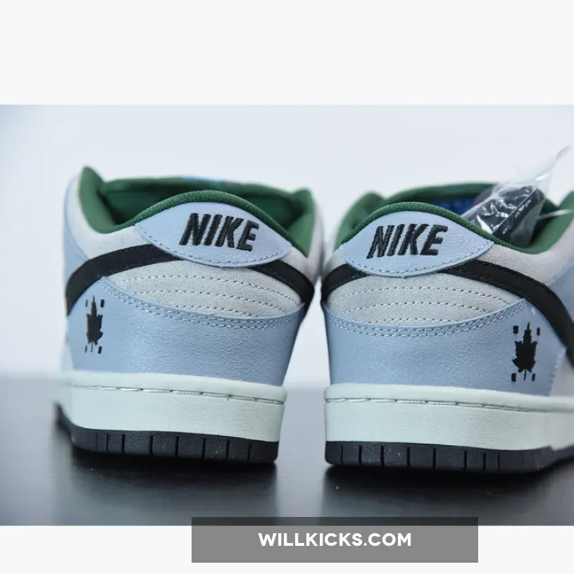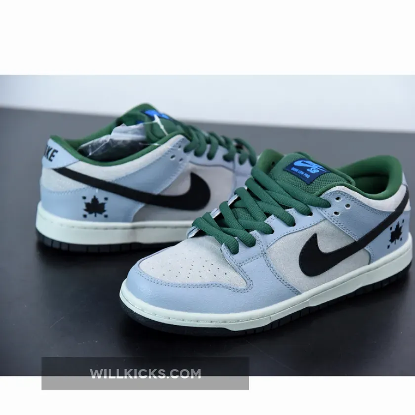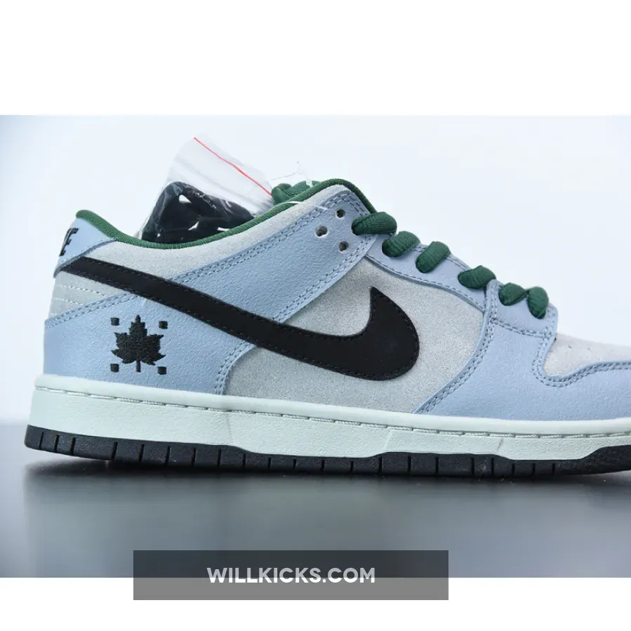 This Nike SB Dunk Low features a Dove Grey suede upper with Black detailing, minor hints of Blue on the tongue and Gorge Green accents. The shoe is also completed with a Maple Leaf embroidery on the heel.