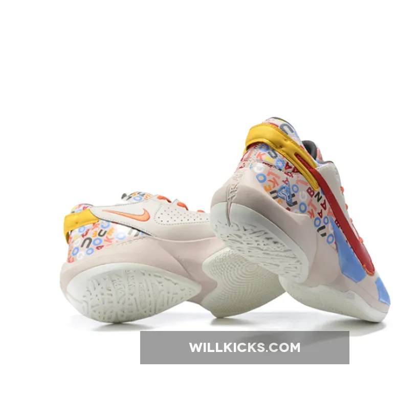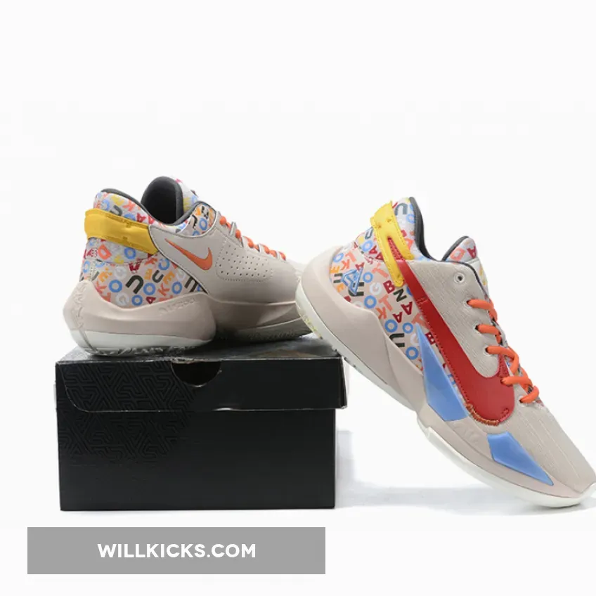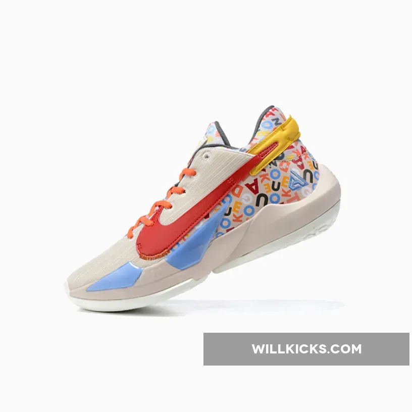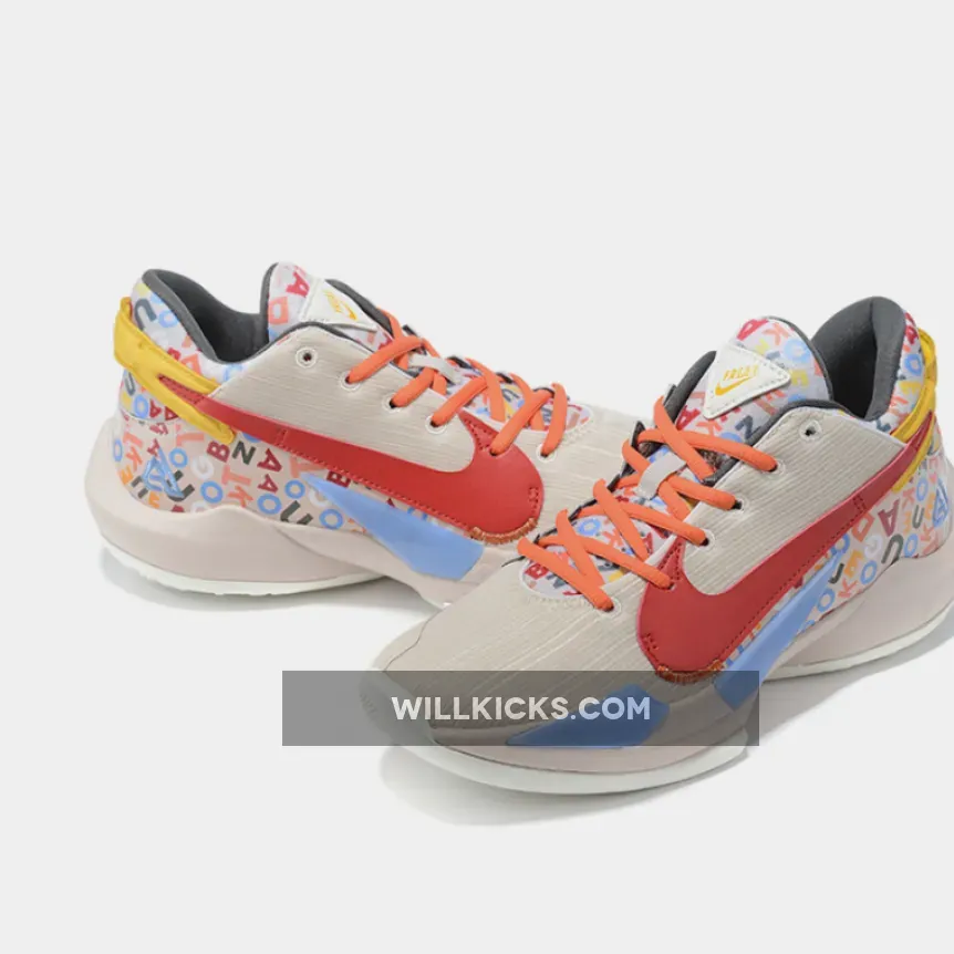 this Nike Zoom Freak 2 comes dressed in a Desert Sand, Sail, Camellia, and Gym Red color combination. First, the pair comes with Sand across the upper while Red lands on the tumbled leather Swoosh. Yellow then lands on the heel tabs and the tongue branding. Furthermore, and the highlight of this pair, we have letters on the heel and tongue that form Greek Freak’s name. However, it’s scattered throughout in different colors. Giannis’s logo adorns the heel while Orange covers the laces. Finally, a Sand midsole and a Sail rubber outsole finish the look.
