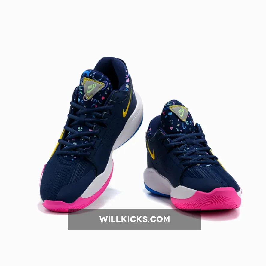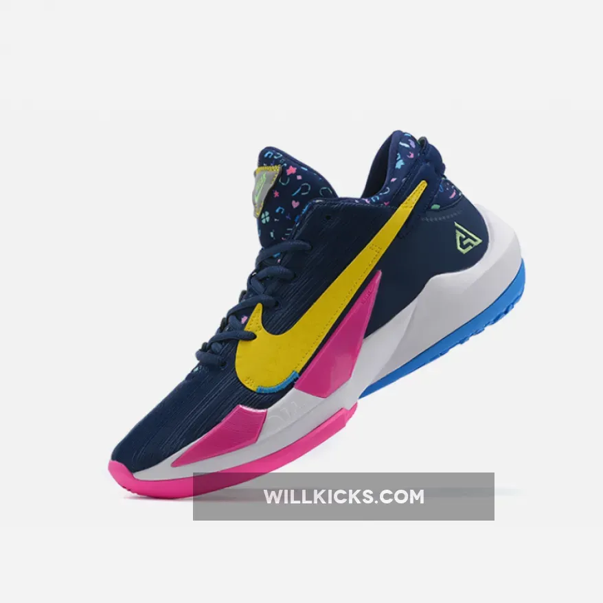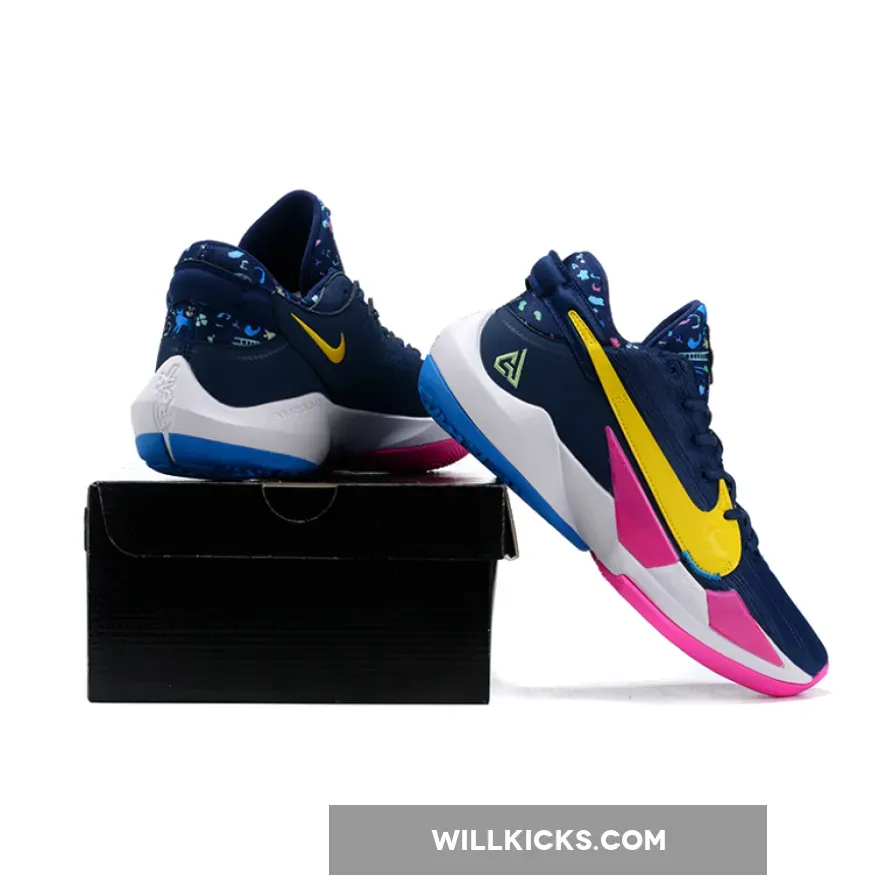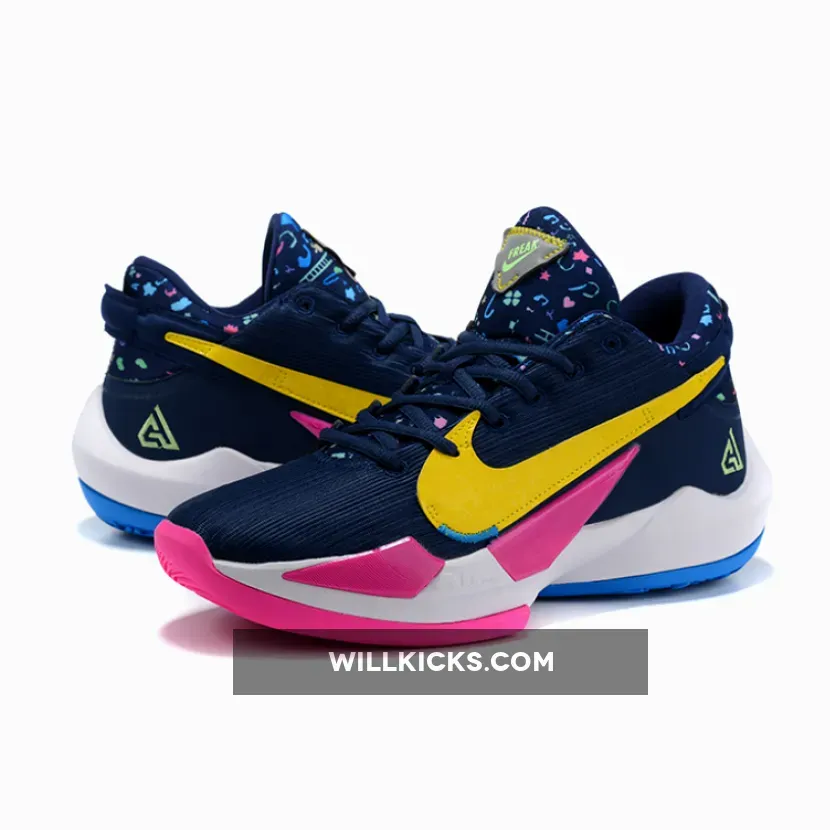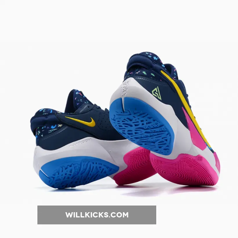 Dressed in a Midnight Navy, Poison Green, and Fire Pink color scheme. This Zoom Freak 2 features a Navy based upper constructed in mixed materials detailed with Golden Swoosh logos on the sides. The lateral side logo is covered with embroidered cats, clubs and other figures. The tongues and heels are also decorated in different illustrations such as umbrellas, ladders, and other graphics. Green branding on the tongues and lateral heel atop a White midsole and Pink/Blue rubber outsole completes the design.