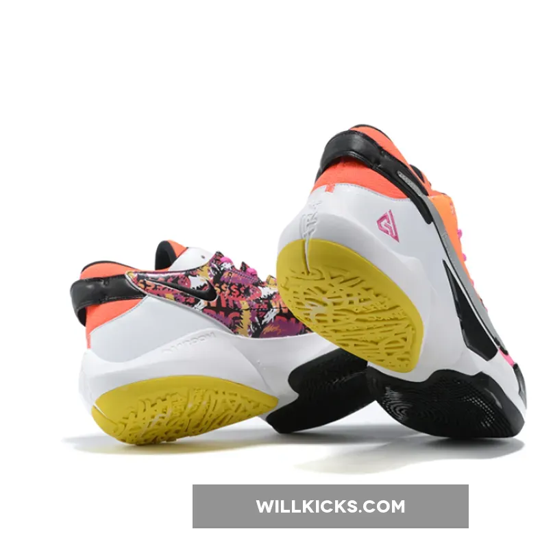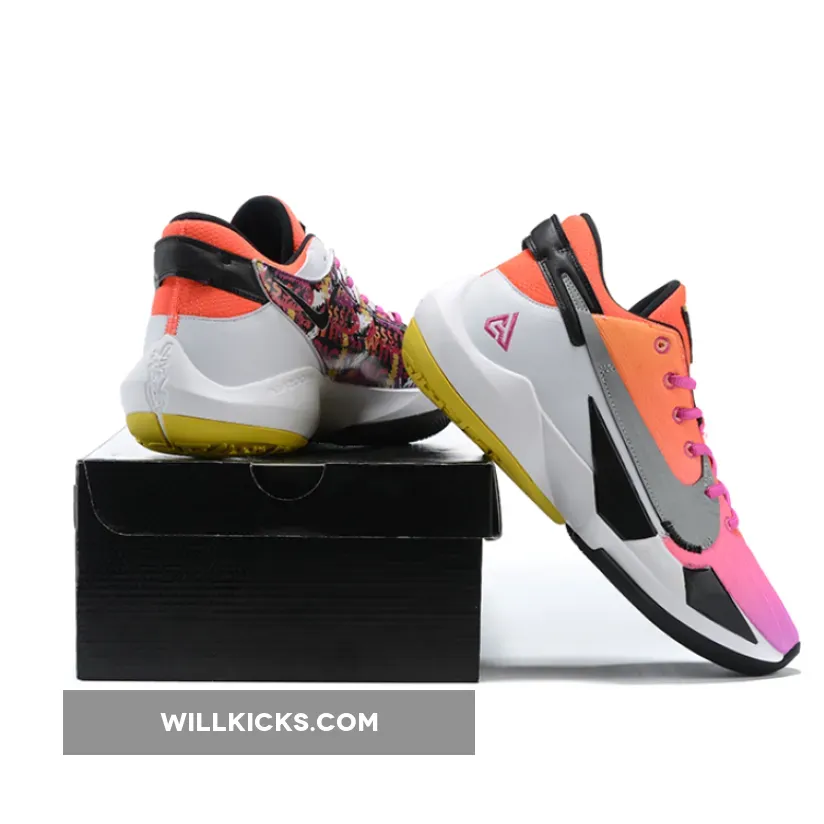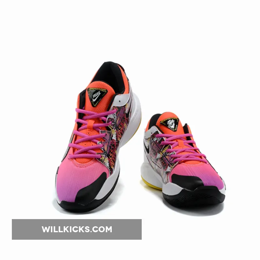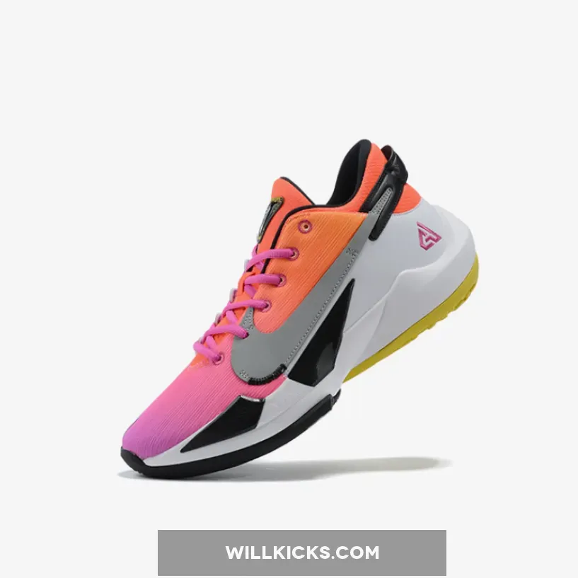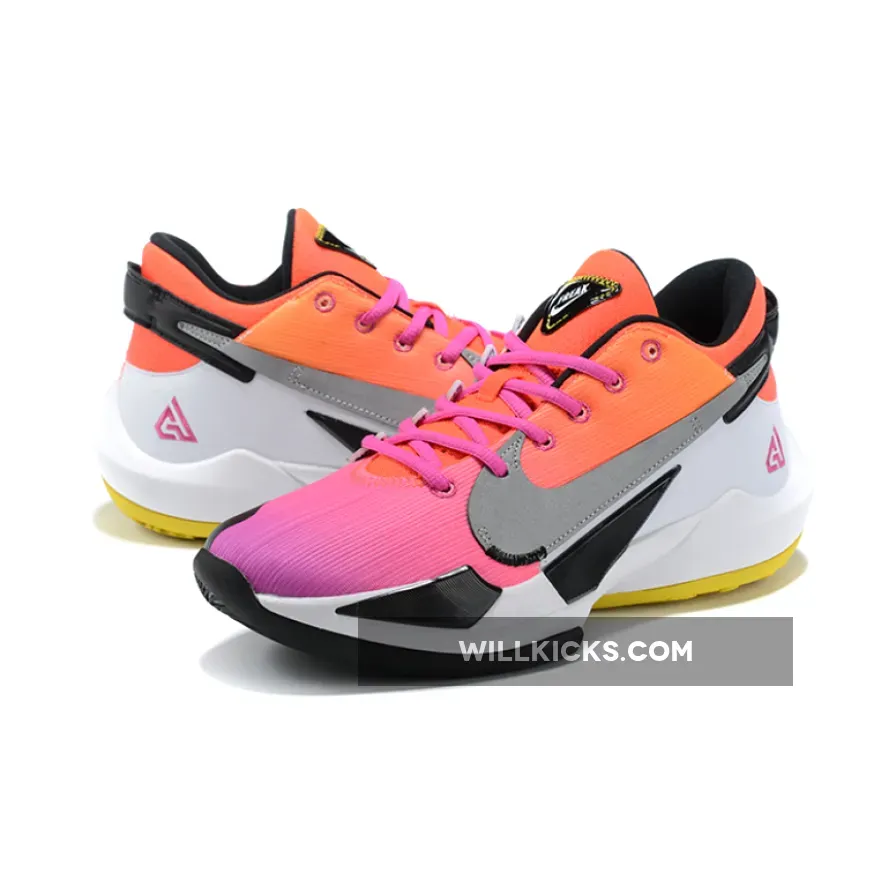 This edition of the Freak 2 sports a Sunset-like color blocking featuring a Pink and Orange gradient upper paired with Black detailing and White leather. An oversized 3M reflective Swoosh on the lateral, while the medial displays a loud graphic with “WIN” and dollar signs. A White midsole atop a Yellow and Black rubber outsole completes the design.