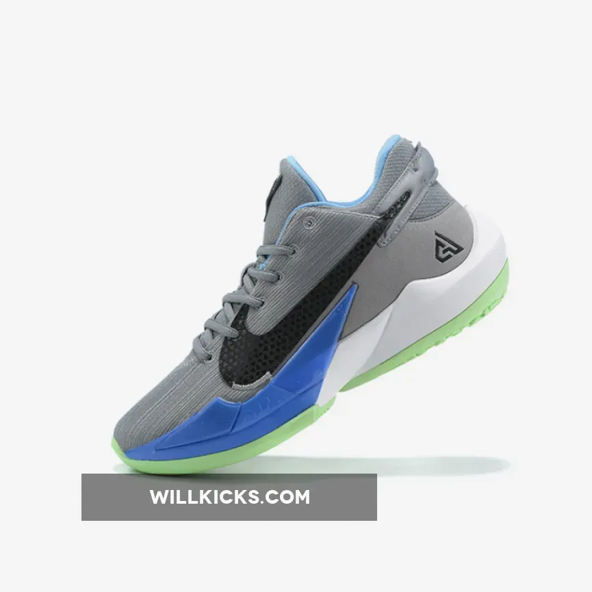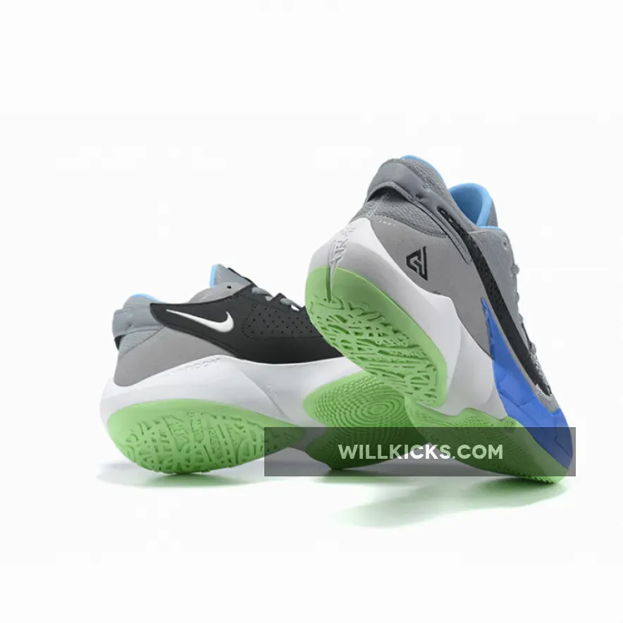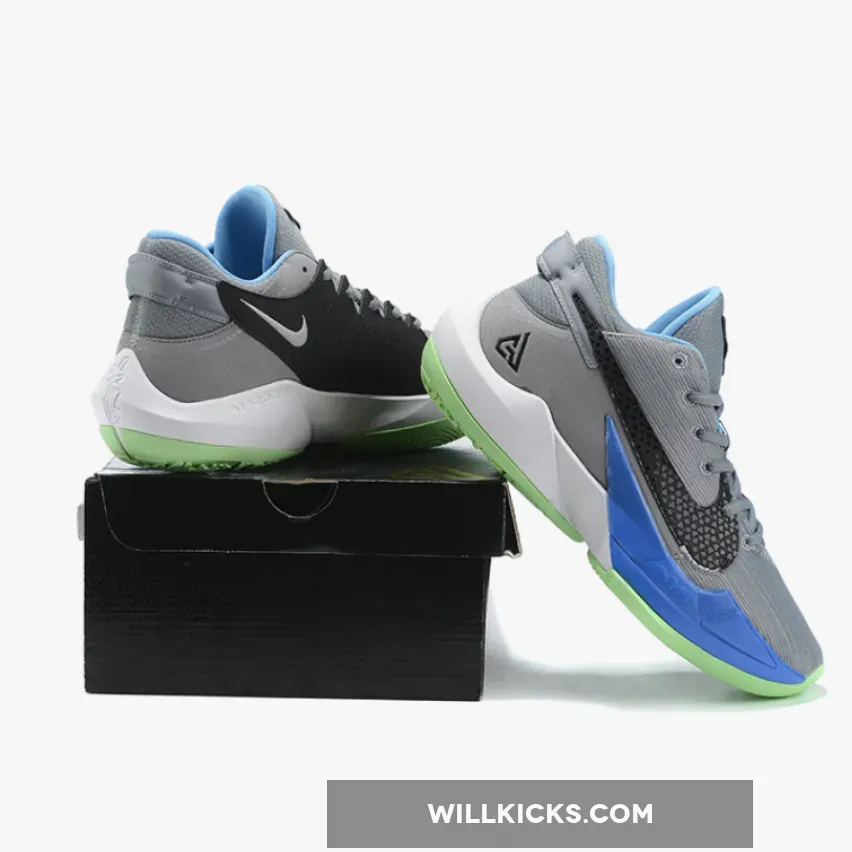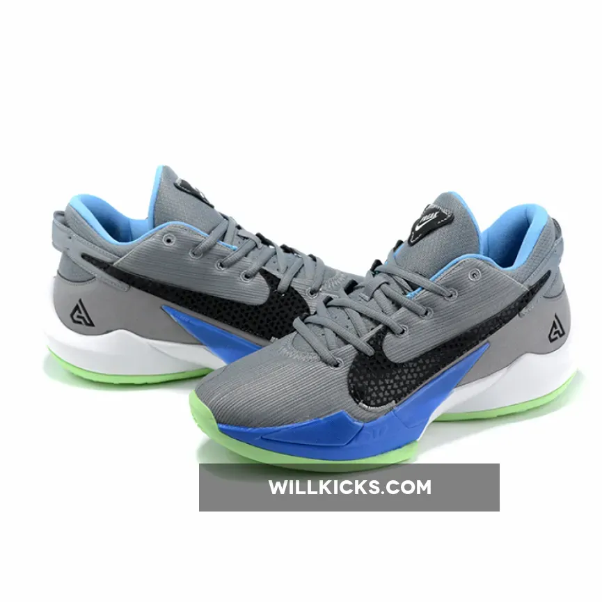 Dressed in a Particle Grey, Black, Blue Beyond, and Sail color scheme. This Nike Zoom Freak 2 features a Grey-based upper with Black covering the medial side.