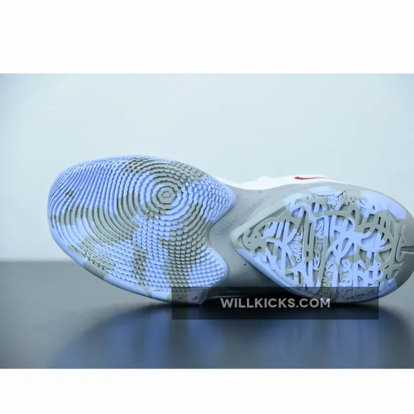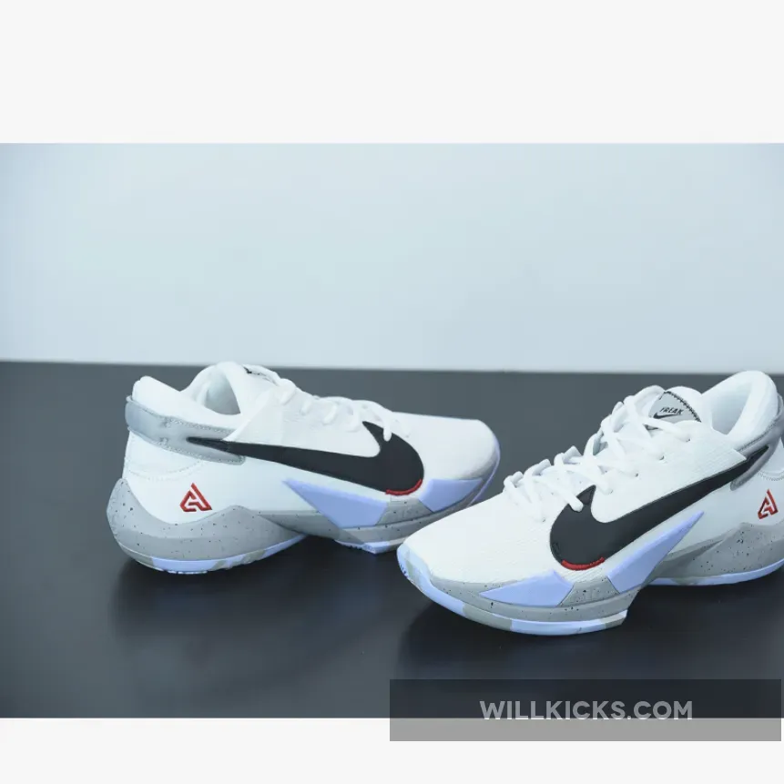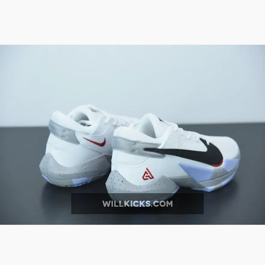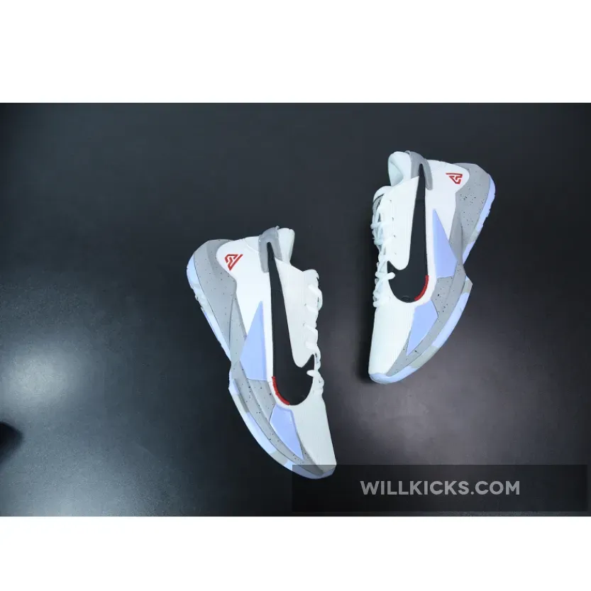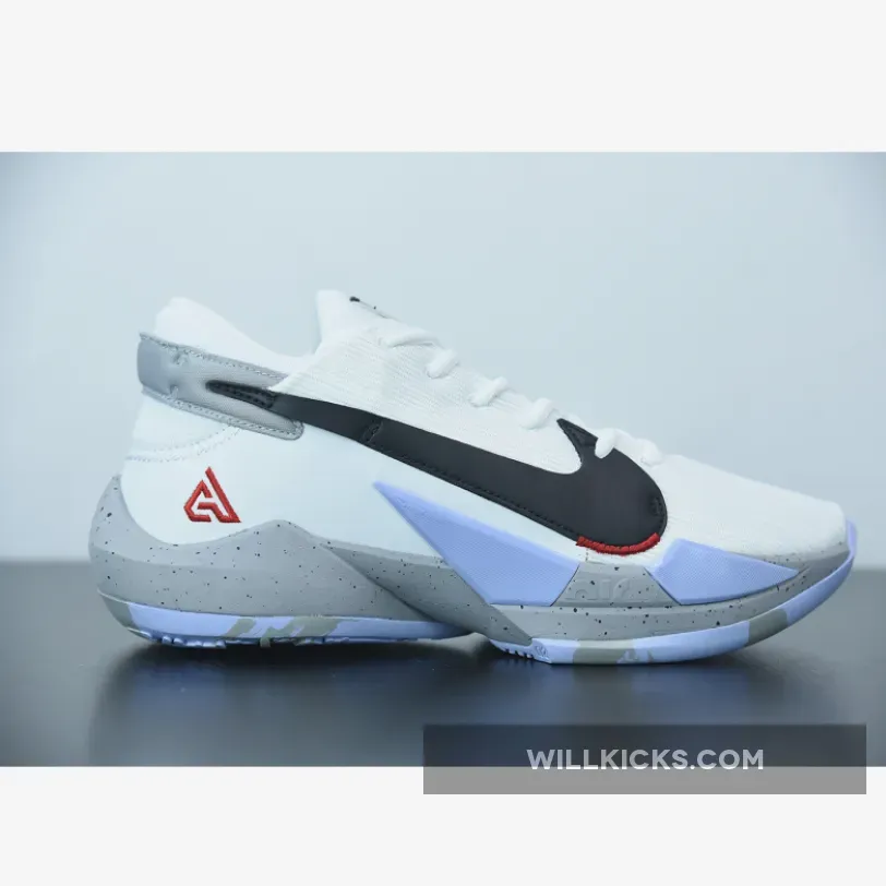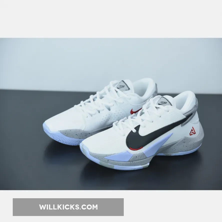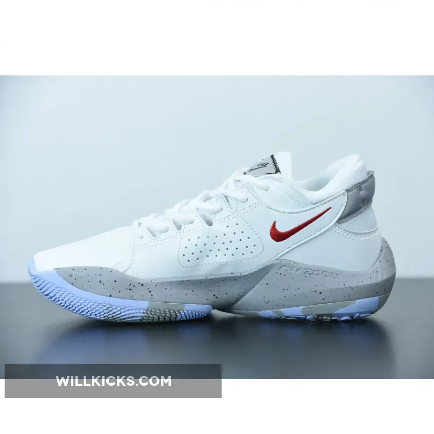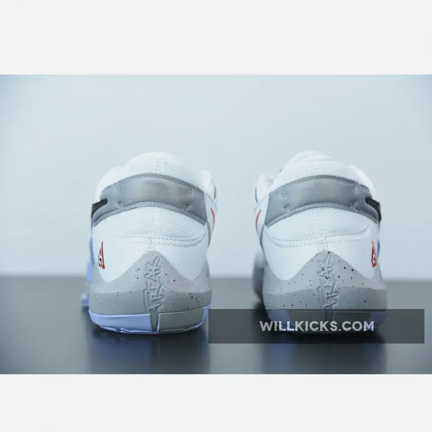 This offering of the Nike Zoom Freak 2 features a White mesh upper paired with a large Swoosh logo on the lateral side. A Grey cement midsole with Zoom Air unit at the forefoot atop a marbled outsole completes the design.