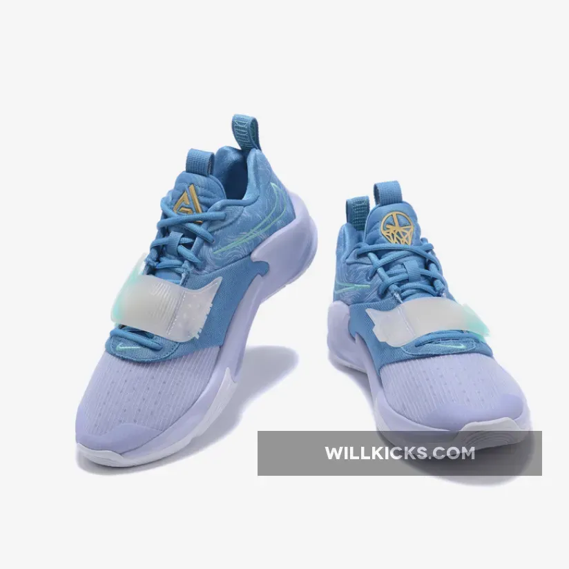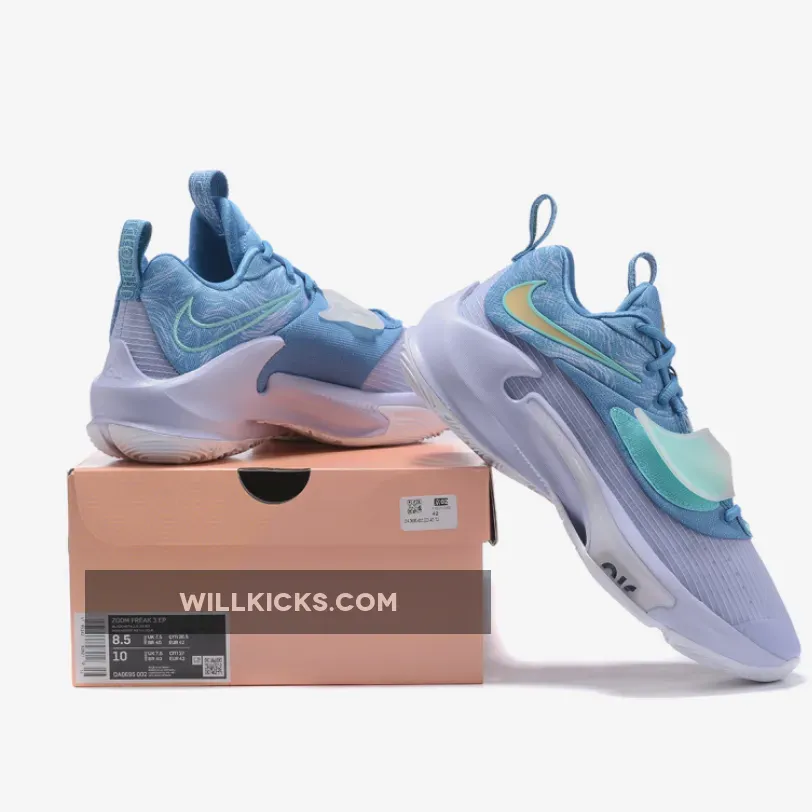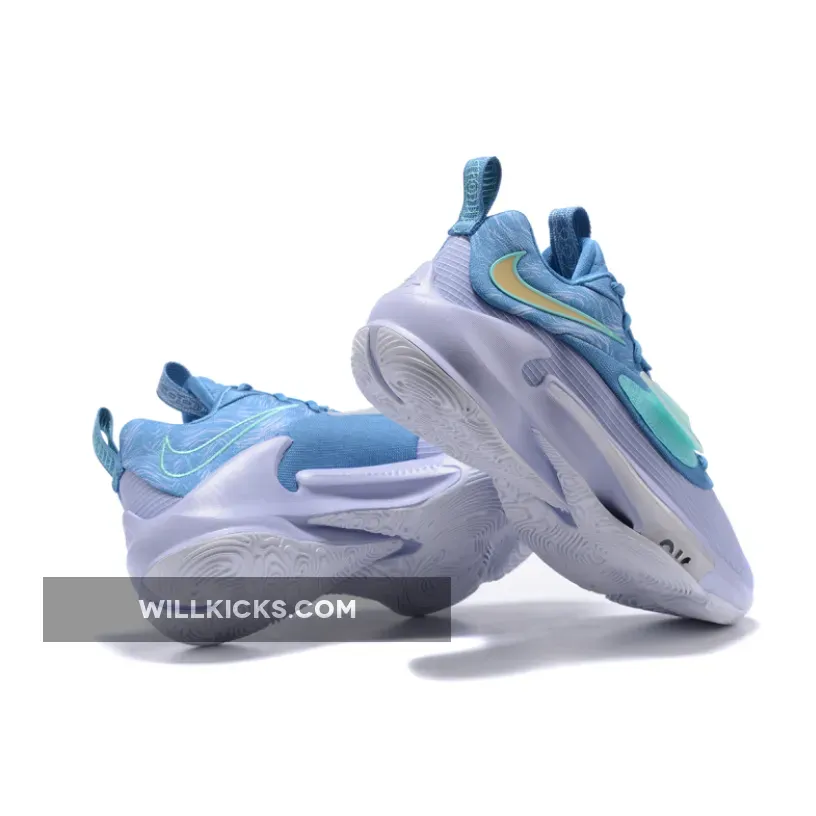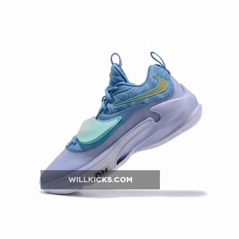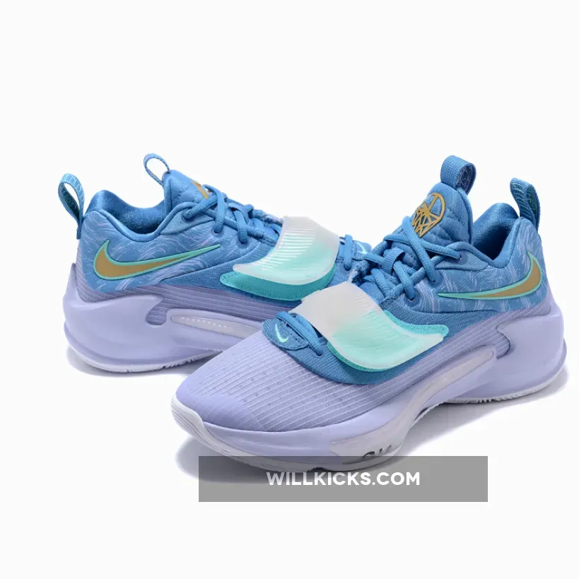 The Nike Zoom Freak 3 ‘Freezing Time’ updates Giannis Antetokounmpo’s third signature with cool, glacial tones. Traditional laces and a translucent midfoot strap secure an upper constructed from lightweight textiles in varying shades of blue. Metallic gold accents make their way to the sneaker’s branding elements, including a rear-facing Swoosh and Giannis’ personal logo on the right tongue. A lightweight Phylon midsole is enhanced with dual Zoom Air units in the forefoot and a stabilizing TPU piece embedded in the lateral sidewall.