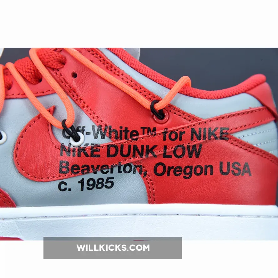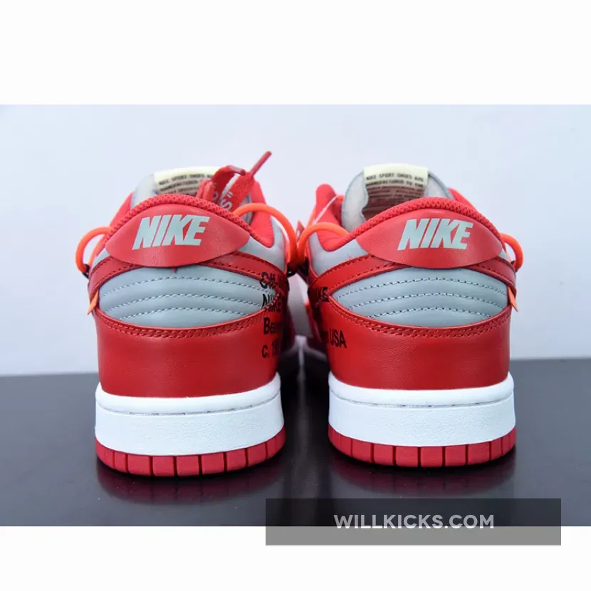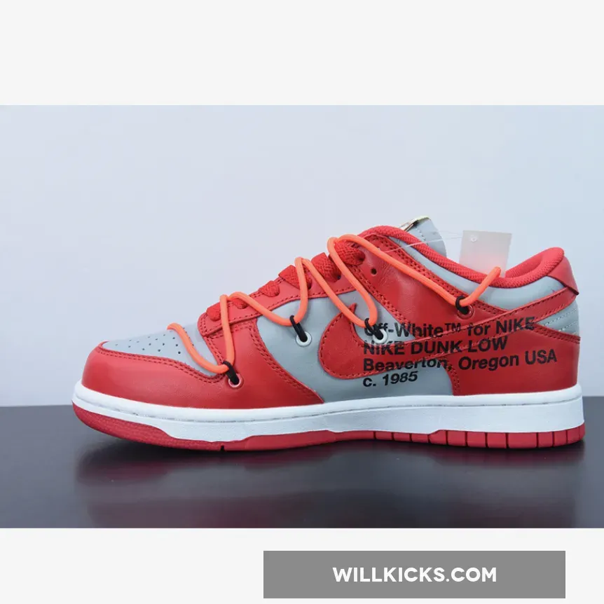This Dunk Low is comprised of a wolf grey leather upper with university red overlays. A unique secondary lacing system, zip-ties, and signature Off-White text on the sides completes the design. These sneakers released in December of 2019 for $170.