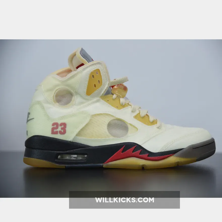 The Off-White x Jordan 5 Sail Fire Red is the latest collaborative sneaker set to launch as part of the ongoing partnership between Virgil Abloh’s Off White brand and the Swoosh label. The Air Jordan 5 has previously seen on Off-White collaboration last year and now Jordan Brand are once again gearing up to release another Off-White Air Jordan 5. When images first leaked of this collaborative sneaker, many believed that they were just a sample pair. However since then Virgil Abloh himself has confirmed that these will be the next Off White x Air Jordan, and they’re packed full of signature details. The uppers are translucent and showcase a reflective tongue, while red accents across the synthetic material and reflective silver details point to the OG AJ5 colorway. The white sail uppers and features are based on a fighter jet , with the reflective silver tongue and zip tie displaying the high-end label’s signature fashion.Underfoot, the shoe features a full-length rubber midsole, with a large visible Air unit present under the heel. This Off-White x Air Jordan release is one of the most hyped in a long time, with fans desperate to get their hands on them since the first look. The Off-White x Jordan 5 Sail Fire Red is set to arrive towards the end of 2020, although the pair are currently delayed for the time being. Make sure to keep it locked in right here at Our Store Supplier for all the latest news and updates regarding this pair ad so many more.