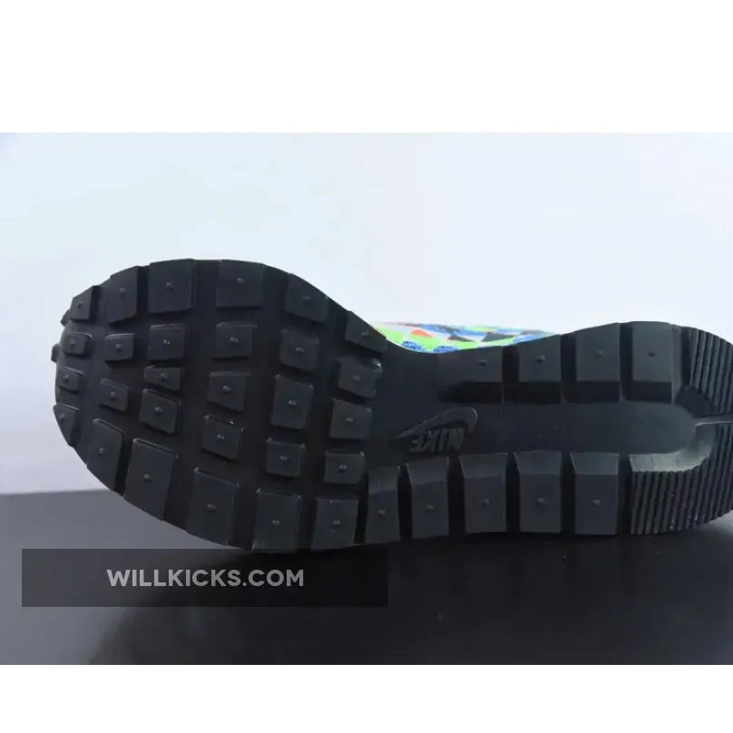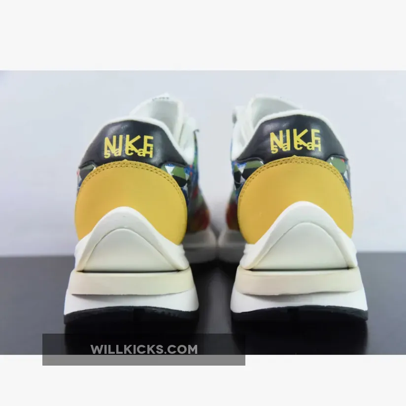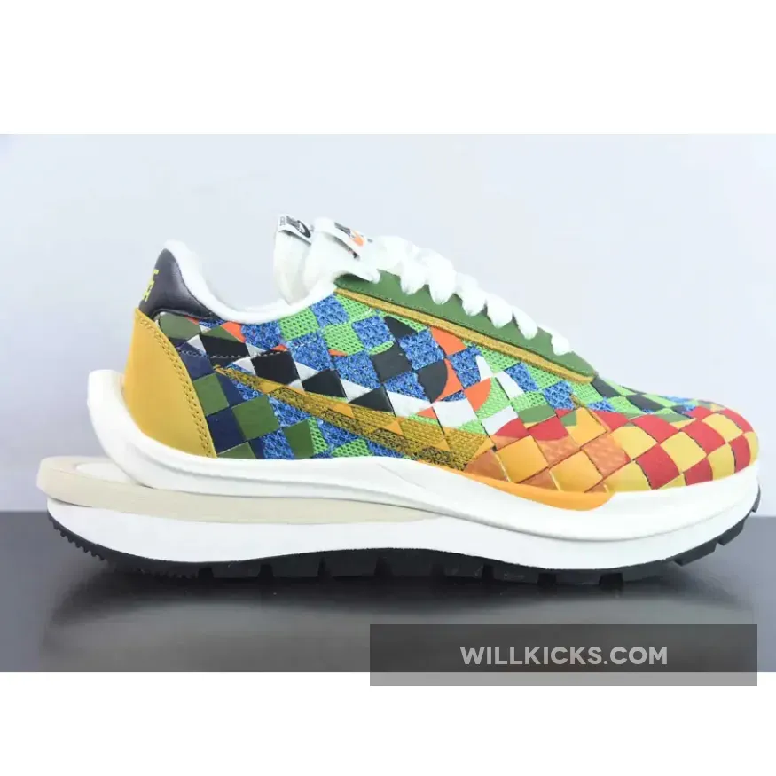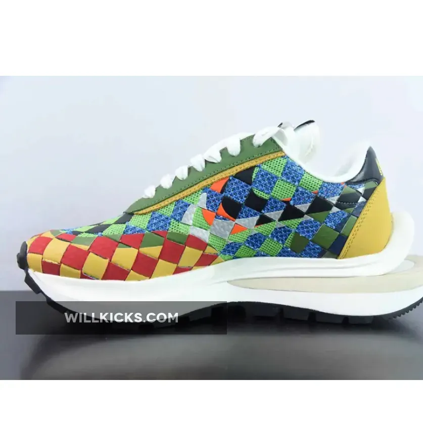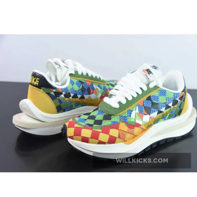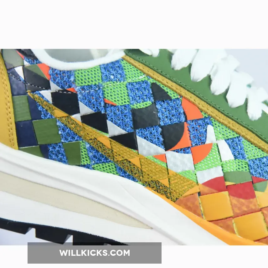 Leather and mesh are woven in a combo of green, red, yellow, and brown near the mudguard and between the upper and sole unit while the base layer features a green mesh spotted throughout the checkerboard design. Suede eyestays host a set of white rope laces that sit atop the doubled tongue which features two hits of sacai x Nike branding.