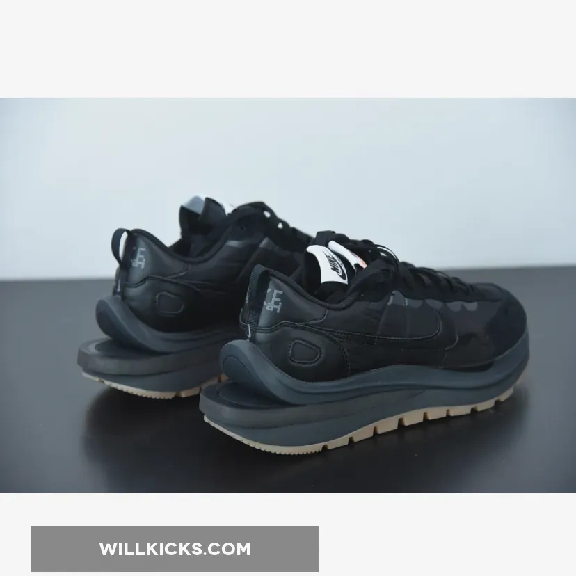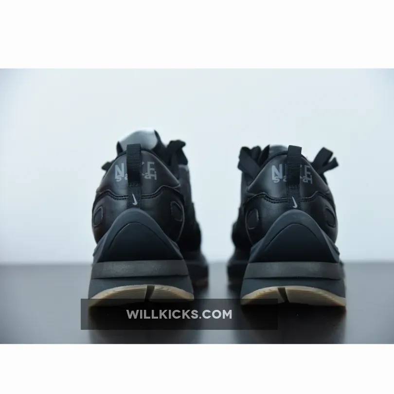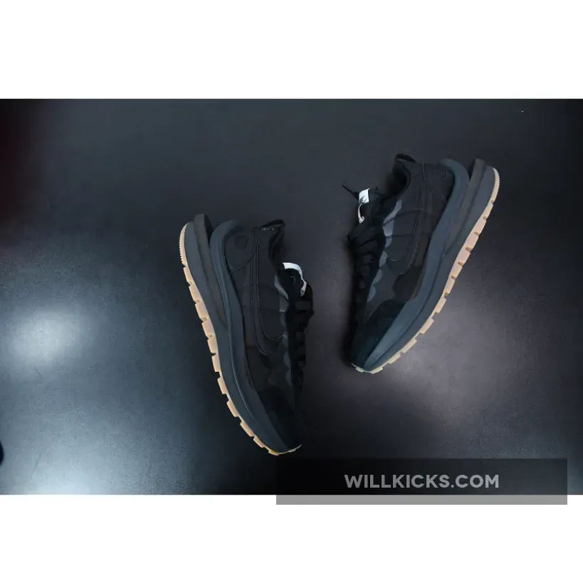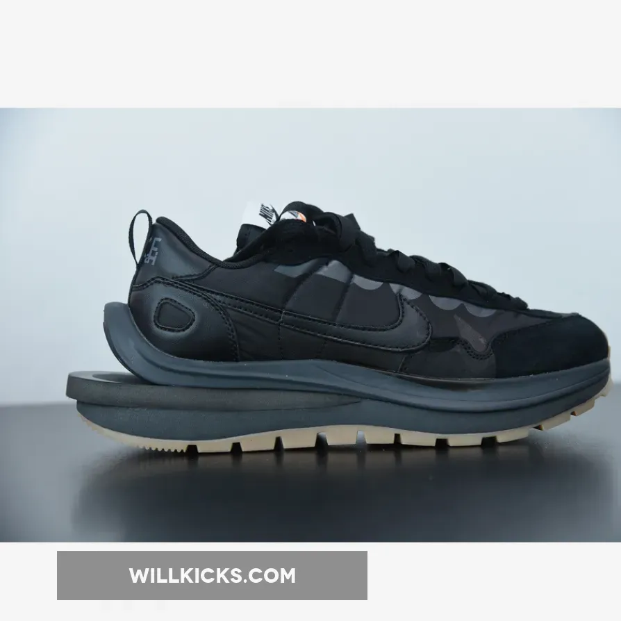 The Nike Vaporwaffle sacai Black Gum features a black nylon upper with matching monochromatic suede overlays and tumbled leather Swooshes. Doubled tongues and Swooshes continue sacais aesthetic of reconstruction and abstraction. At the base, a stacked foam midsole atop a gum outsole adds the finishing touch.