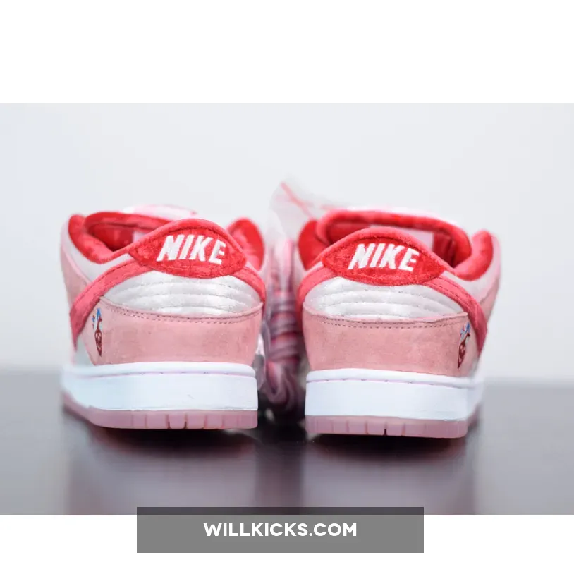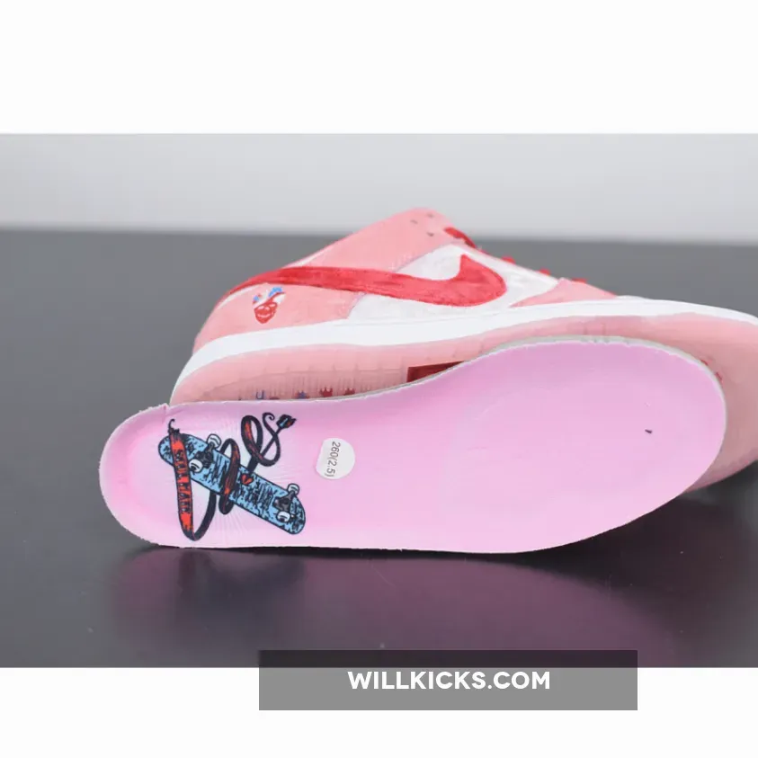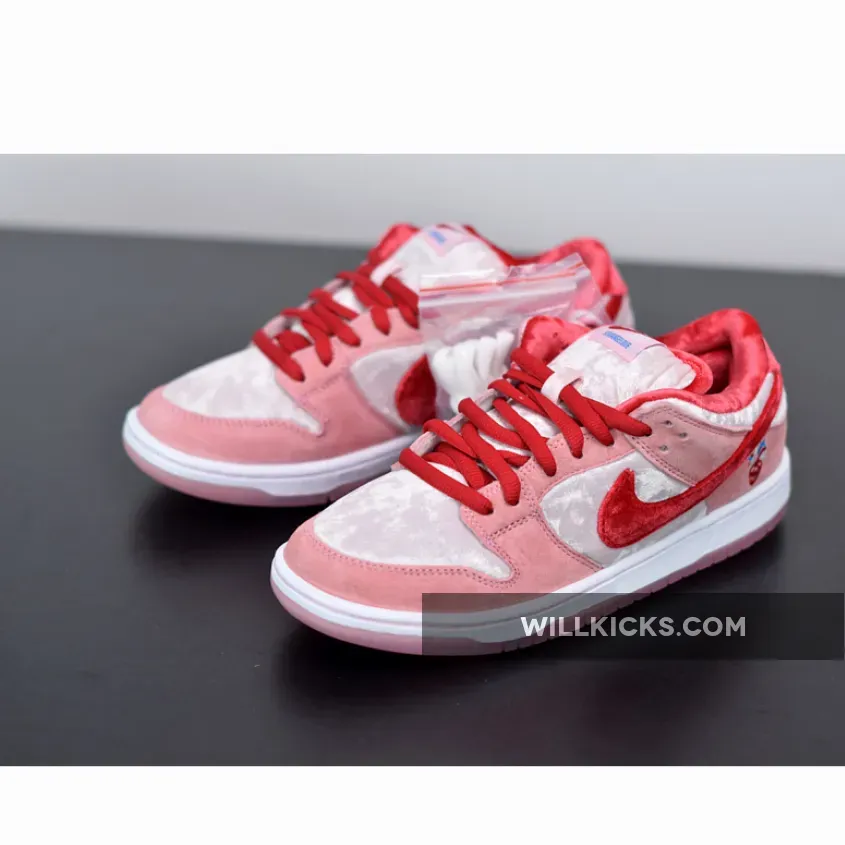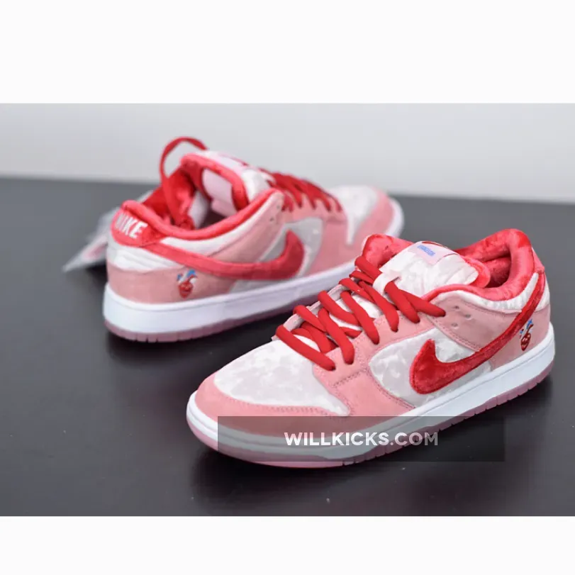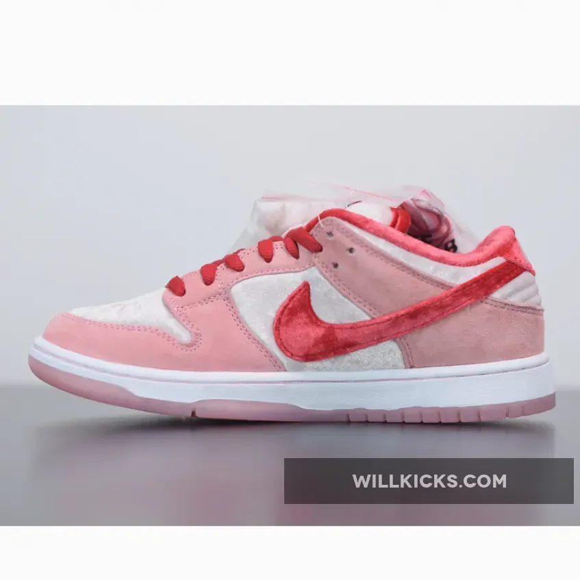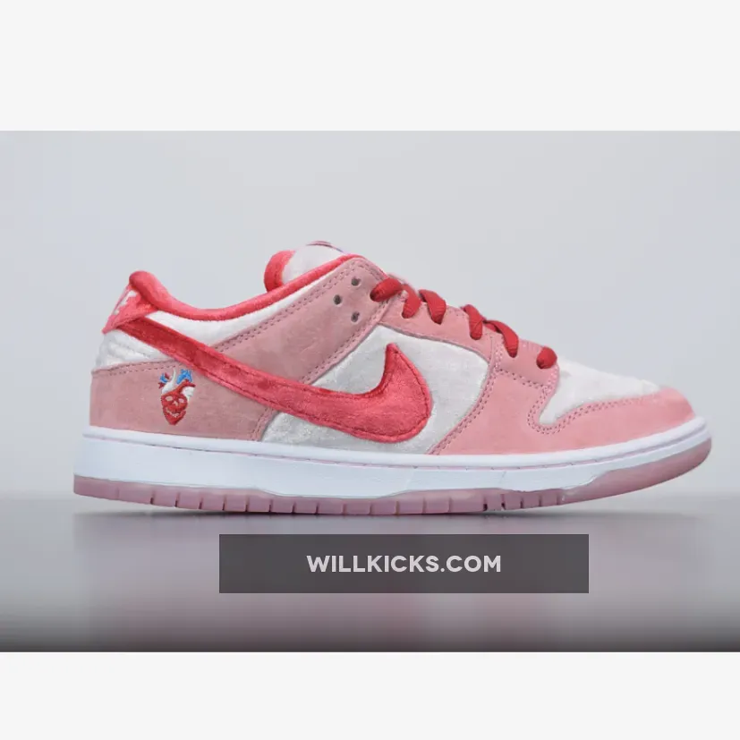 The Nike SB Dunk Low StrangeLove Skateboards (Regular Box) is a stylish and luxurious sneaker that features a pink velvet upper with suede overlays and a red velvet Swoosh. The Strangelove branding on the tongue, insole, and translucent outsole completes the design of the sneaker. The sneaker was made in Italy with the finest materials and craftsmanship. Get ready to turn heads with these sneakers.