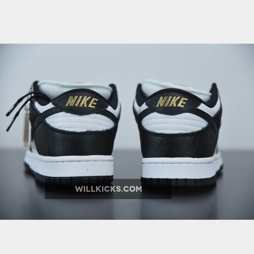 the forthcoming pair indulges in a smooth leather base that allows its contrasting surroundings to revel in the spotlight. The overlays on the low-top silhouette are muted in comparison to adjacent “Mean Green” and “Hyper Blue” options, but their faux crocodile skin construction indulges in similar statement-making. Furthermore, accompanying “Metallic Gold” dubraes, branding and midfoot star motifs; “WORLD FAMOUS” aglets; and bold red sock-liners deliver flair to the otherwise simple, skate-ready Dunk Low. Underfoot, the Air Jordan 1-reminiscent sneaker boasts a tried-and-proven “yin-and-yang” palette across its sole unit.