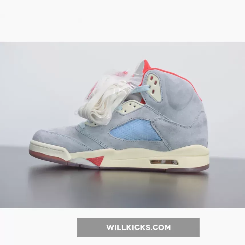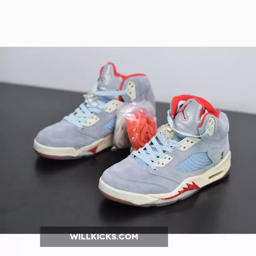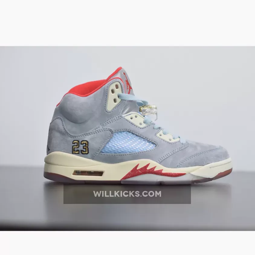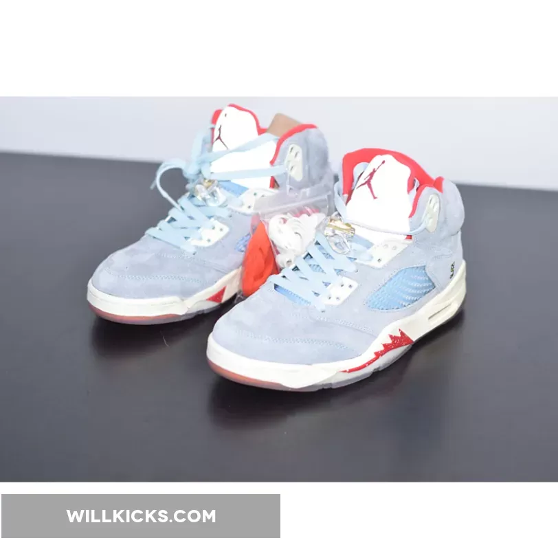 One pair features an Ice Blue upper with University Red accents atop a Sail midsole, while the other sports a University Red upper with Ice Blue accents atop a Black midsole. Both are completed with Trophy Room branding and embroidered number “5” on the heels atop icy translucent outsoles.