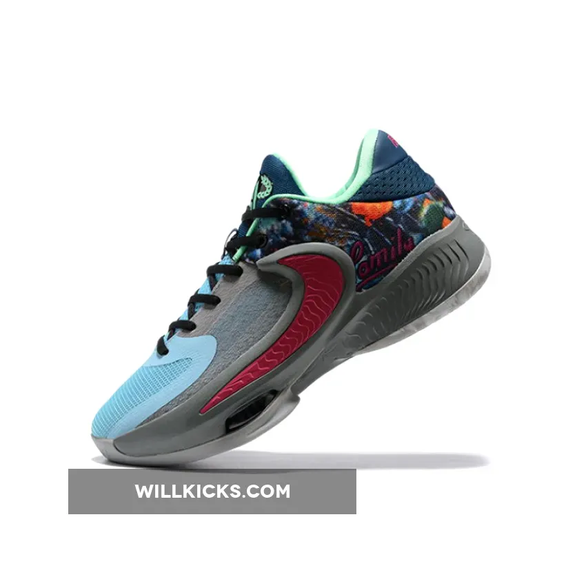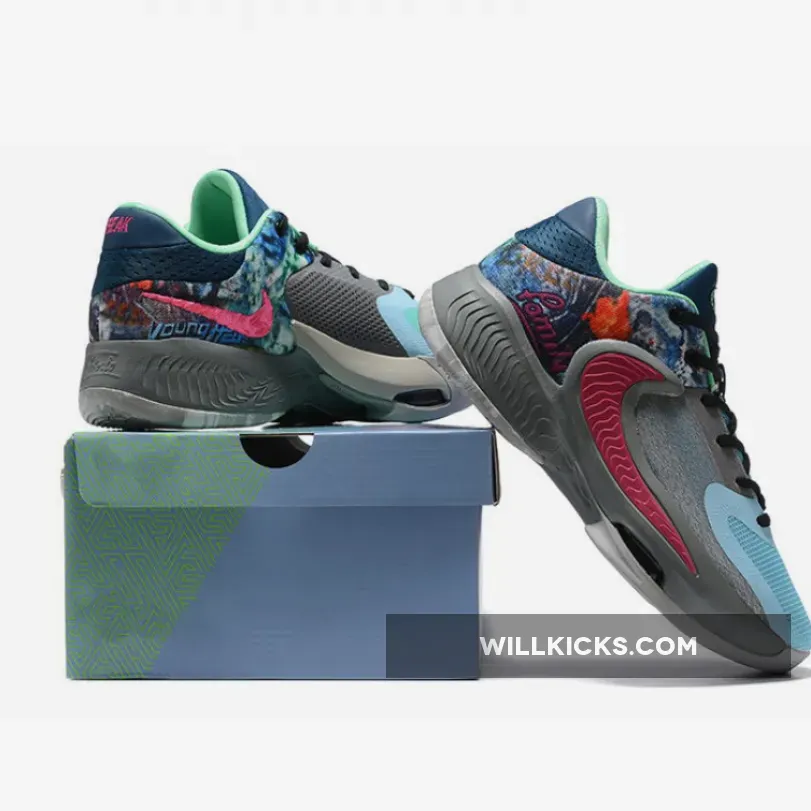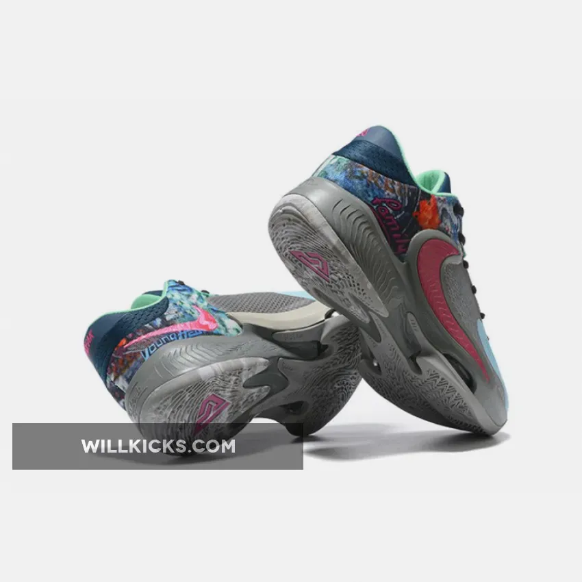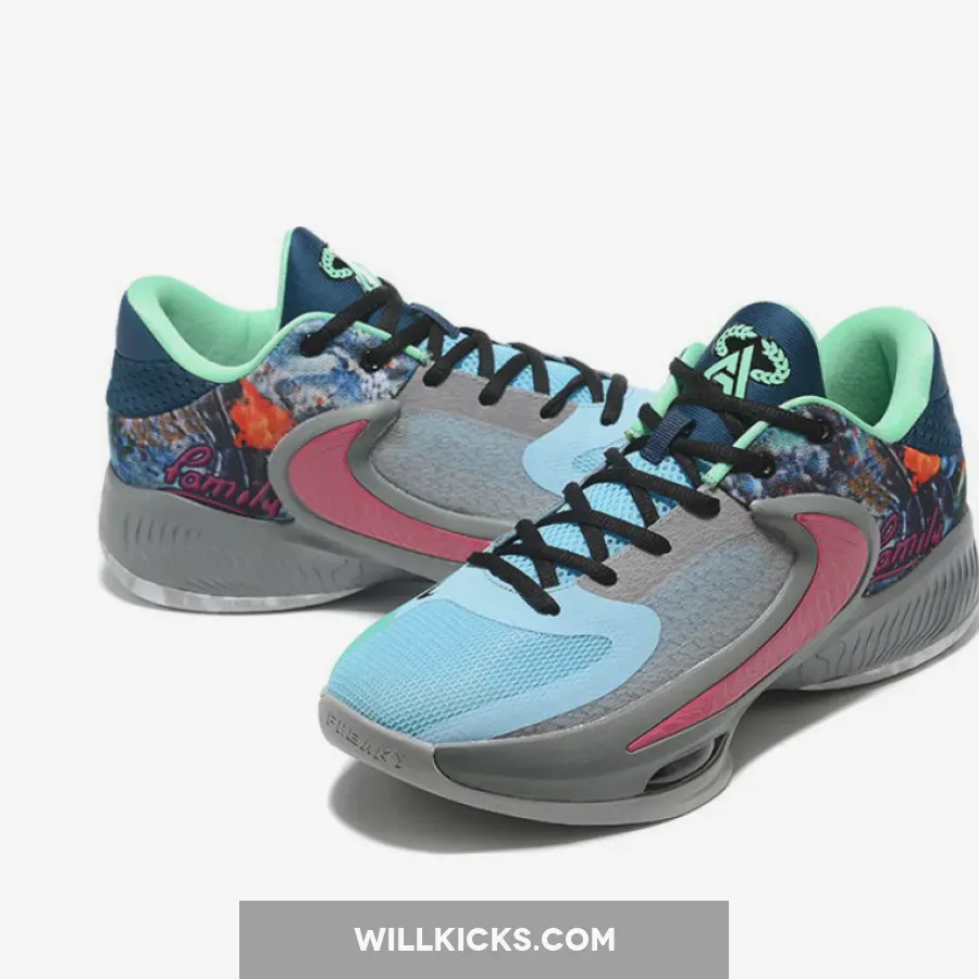 The father of two and second-oldest brother in a family of seven has always paid tribute to both the sacrifices and upstanding character of his household by way of his signature line with Nike. The latest colorway of the Zoom Freak 4 “Family” follows suit in the familial tree of silhouettes. A dark gray takes hold in the central portion of the model in the ribbed midsole and a thin layer of protective mesh that lies above a vibrant baby blue accent. The former’s bright tone is mirrored on the forefoot panel while a turquoise accents the sock-liner and vamp overlays with the palette of blues being extended as navy fills the upper heel counter and tongue construction. Amidst an already loudly toned ensemble, the heel counter offers multi-color graffiti style collage including “family” and “young HEIR” inscribed just above the medial midsole with both the lateral and interior Swooshes opting for a hot pink treatment.